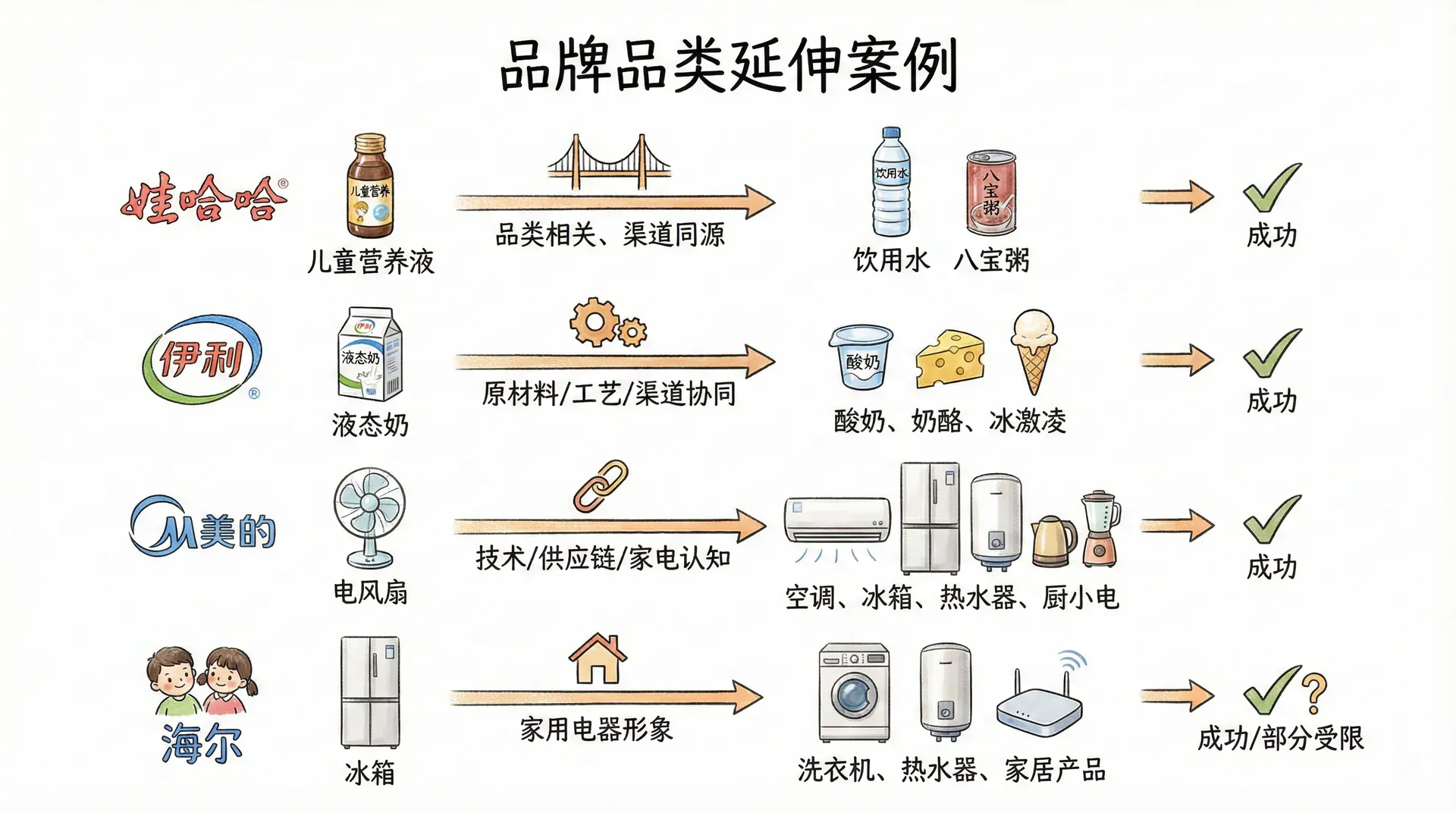 品类延伸指品牌从原有产品线向相关或相近的新产品品类拓展。这在中国企业中尤为常见。例如: