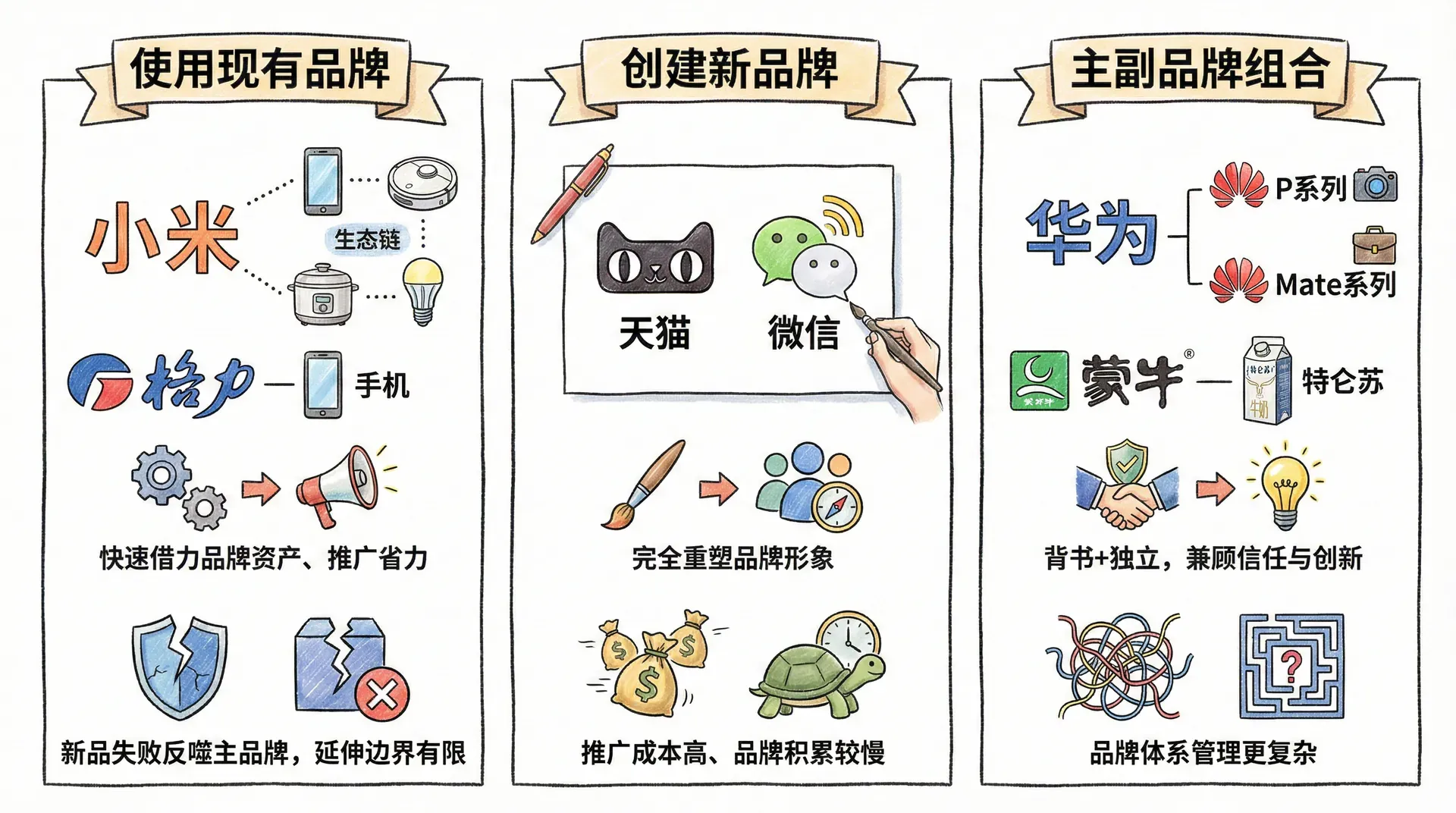 企业在推出新产品时,面临的首要品牌决策是:究竟是借用现有品牌,还是创立全新品牌,抑或采用“主品牌+子品牌”(主副品牌)等组合模式?这个决策不仅直接影响新产品上市的推广效率、市场接受度,还将深刻影响企业整体品牌资产的积累和未来品牌战略演进。