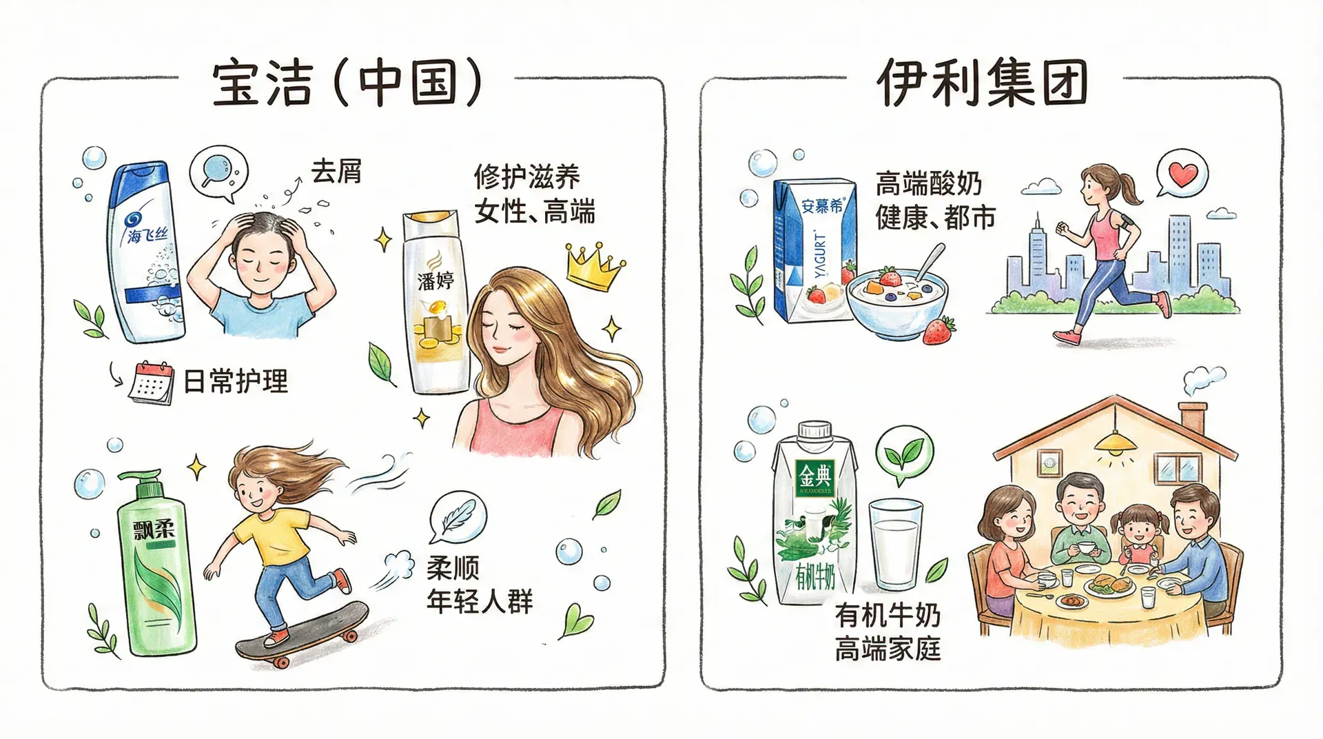 宝洁(P&G)中国:旗下拥有海飞丝、潘婷、飘柔、沙宣等洗护品牌。每个品牌定位区隔——海飞丝主打去屑,潘婷侧重养护,飘柔突出顺滑,沙宣聚焦专业造型。消费者通常并不知晓这些品牌“同根同源”,而是各自独立选择、竞争。