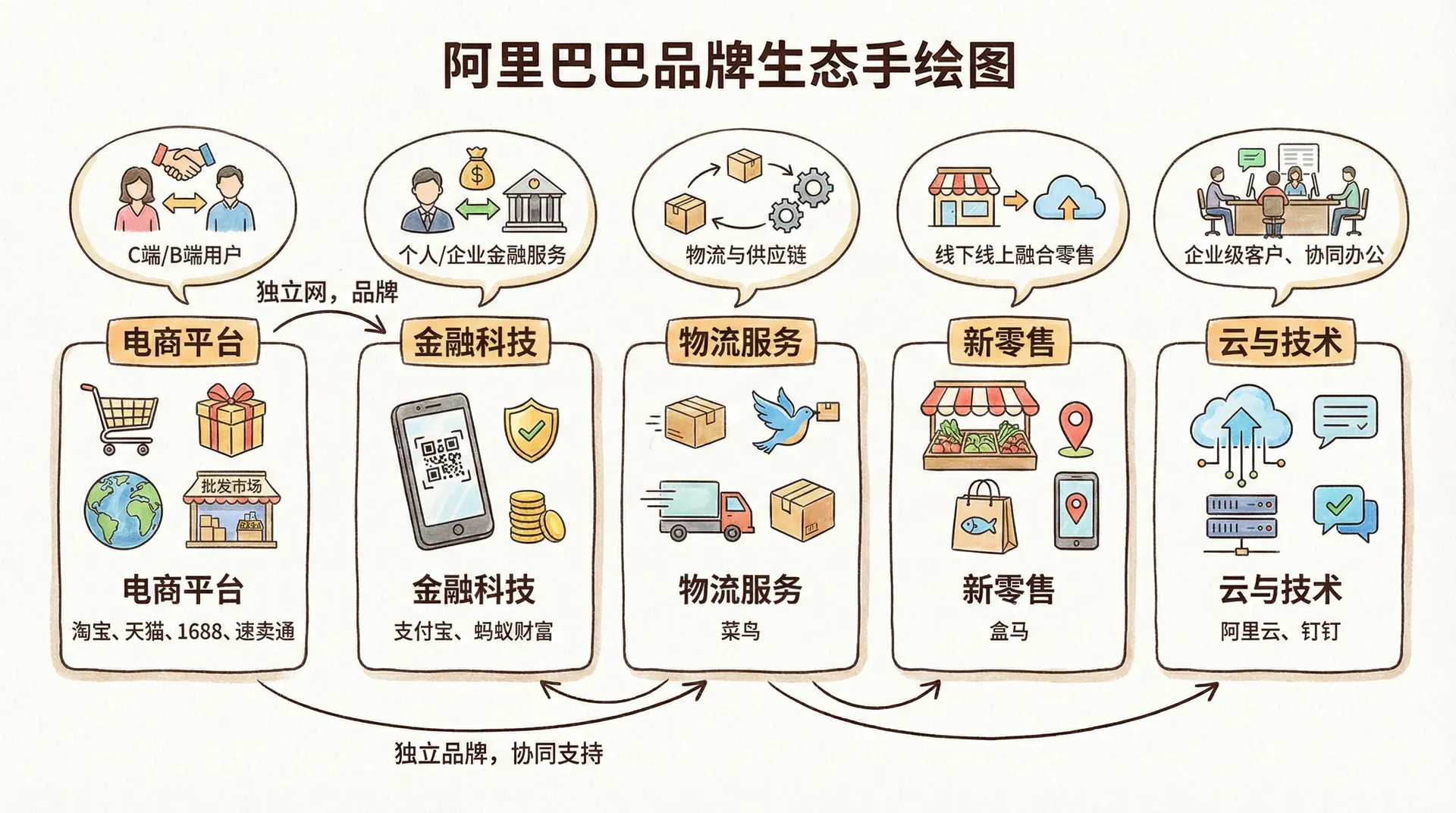 阿里巴巴的品牌演进最具代表性。创业初期,“阿里巴巴”品牌专注B2B电商,仅面向企业客户。2003年推出C2C平台“淘宝”,专门针对普通消费者,品牌独立运作,迅速打开大众市场。此后,阿里巴巴陆续打造天猫(高端B2C)、支付宝(第三方支付)、菜鸟(物流)、盒马(新零售)、钉钉(企业通讯)等众多品牌。