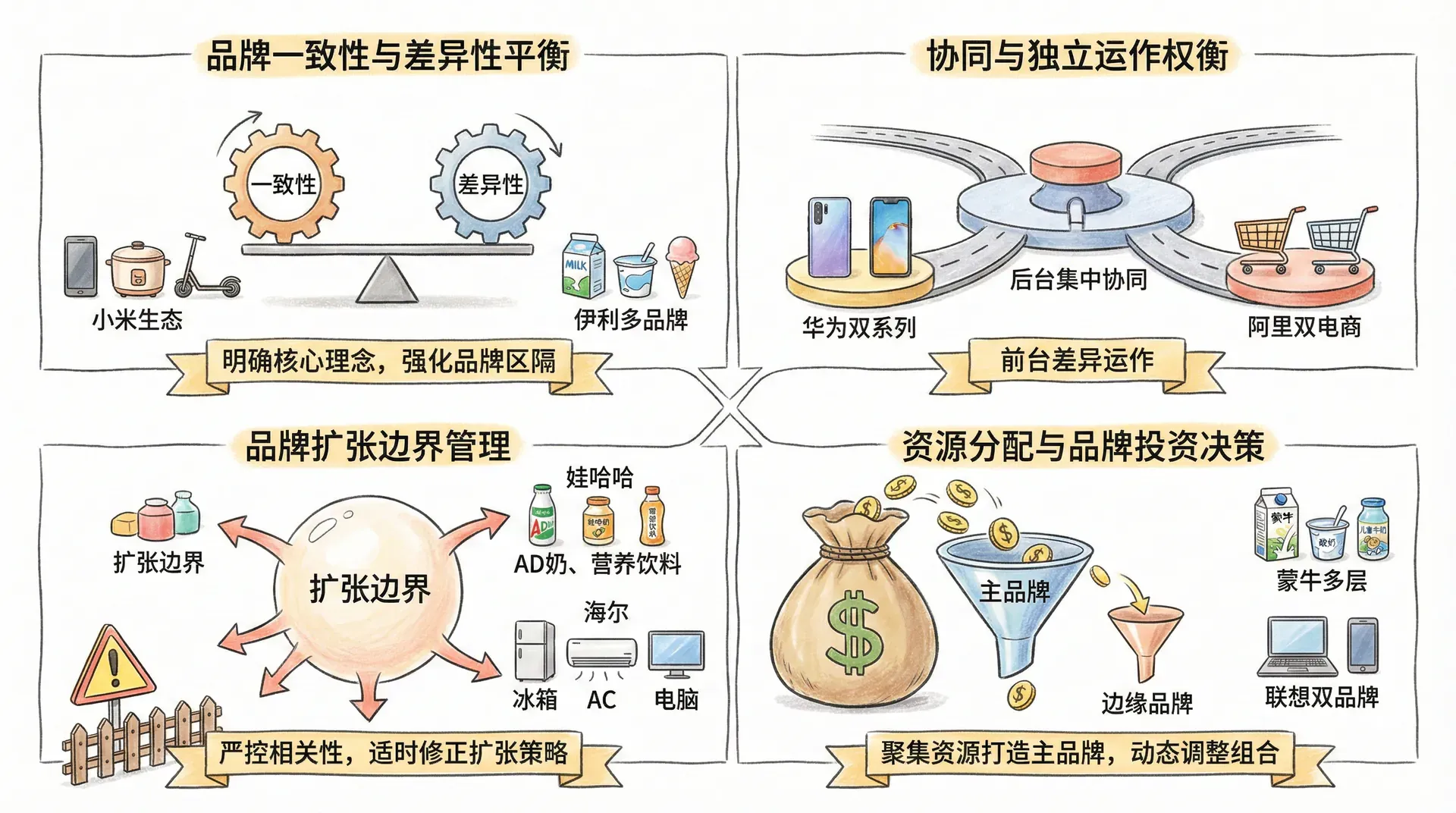 品牌架构管理是一项复杂且动态的系统工程,企业必须在品牌统一性与差异化、协同与独立性、短期业务效益与长期品牌价值等多重维度间取得平衡和优化。