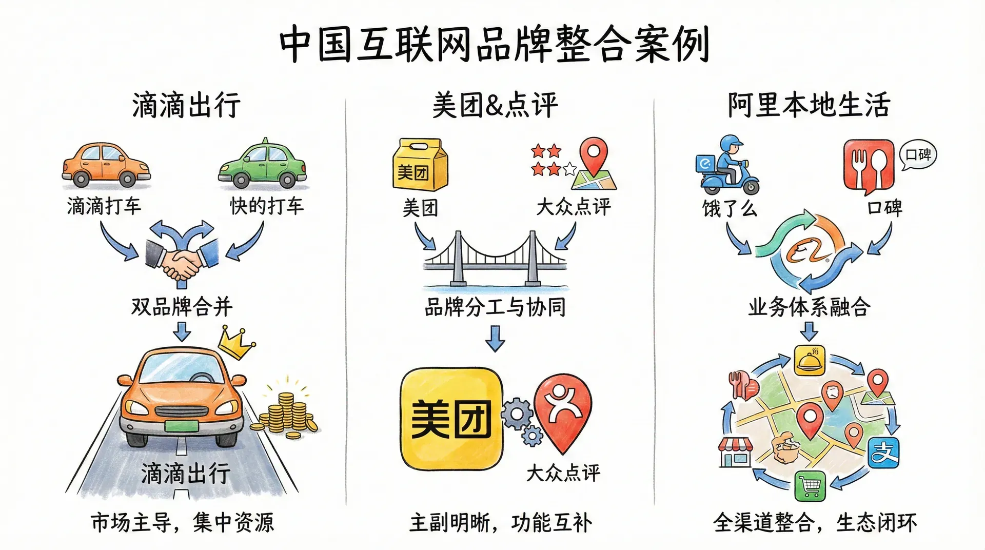品牌整合 是指将多个品牌合并或优化品牌体系,以降低成本、提升影响力或化解内部冲突。中国市场中,“饿了么”与“口碑”合并就是品牌整合的例证。阿里巴巴收购并推动饿了么、口碑业务双品牌战略,随后通过产品、流量及服务的整合,形成更强的本地生活服务平台。再如美团和大众点评合并后,逐渐将“美团”打造成主品牌,而大众点评更专注于餐饮点评领域,通过整合提升整体品牌效力和市场协同。
