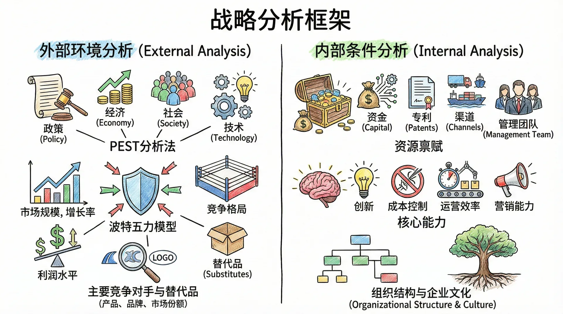 1. 战略分析——知己知彼,全面洞察 企业要科学制定战略,首要前提是深入理解自身能力与外部环境。战略分析通常分为外部环境分析与内部条件分析两部分: