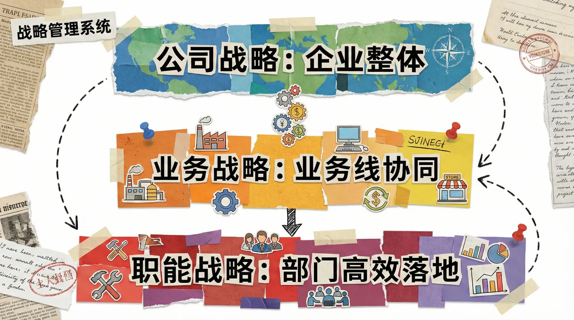 战略管理并非简单的高层决策,而是一个结构化、多维度的系统。根据战略覆盖的范围和影响深度,企业的战略通常分为三个层次:公司战略、业务战略、职能战略。这种分层结构有助于实现从企业整体到每一个部门、每一条业务线的目标协同与高效落地。