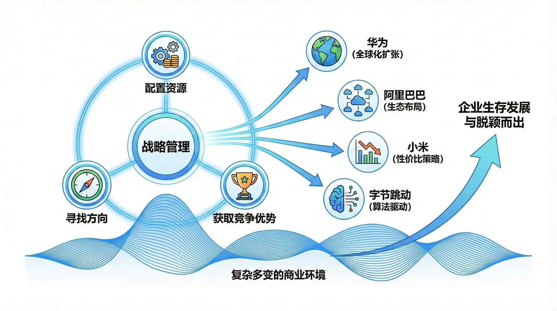 战略管理是企业在复杂多变的商业环境中寻找方向、配置资源、获取竞争优势的核心能力。从华为的全球化扩张到阿里巴巴的生态布局,从小米的性价比策略到字节跳动的算法驱动,成功企业的背后都有清晰的战略思维支撑。战略管理不仅关乎企业的生存发展,更决定了企业能否在激烈的市场竞争中脱颖而出。本章将带你认识战略管理的本质,理解战略思维的价值,掌握战略管理的基本框架。