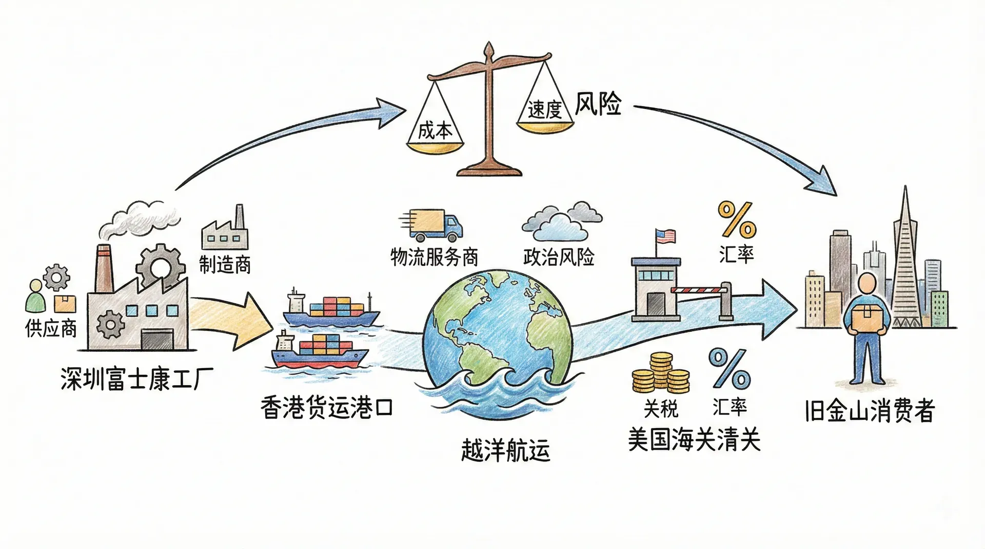 当一件贴着"Made in China"标签的iPhone从深圳富士康工厂出发,经过香港货运港口、越洋航运、美国海关清关,最终送达旧金山消费者手中,整个过程涉及十几个国家的供应商、制造商、物流服务商。这一条复杂的全球供应链,并非偶然形成,而是企业在成本、速度、风险之间反复权衡后做出的战略选择。以下将从全球化背景出发,探讨企业如何设计跨越国界的供应链网络,以及在面对关税、汇率、政治风险时如何做出理性决策。
