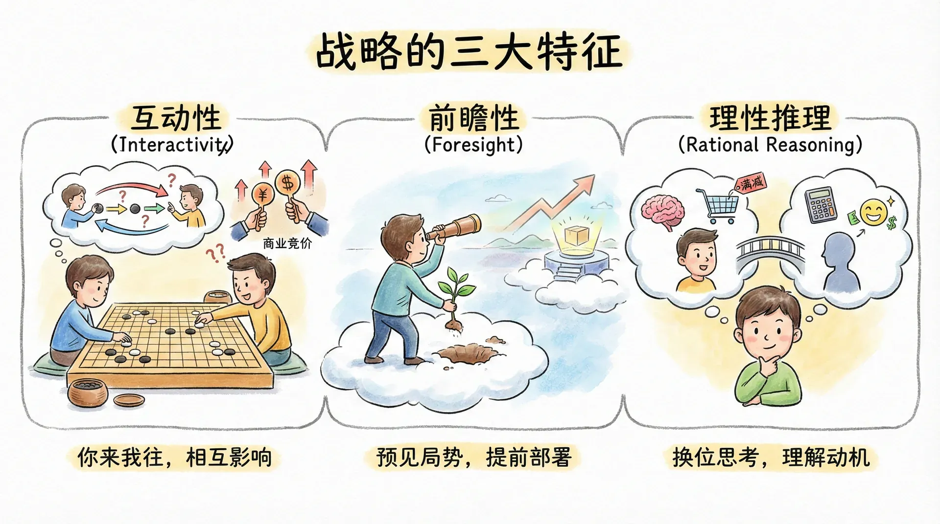 策略行为具有三个核心特征,我们可以用如下图片简明梳理: