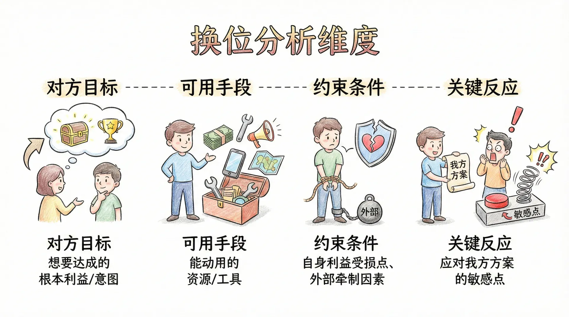换位思考远不止表面“站在对方角度”,而是要深挖并梳理对方的动机、约束、优先级与可能反应。例如华为2019年面对美国的技术封锁时,其管理层不仅分析对方的直接目的(如削弱华为、迫使让步等),还要拆解美国的实际可行手段(技术禁运、贸易壁垒、施加盟友压力等),以及对美国本土企业、盟友关系和全球市场的影响。只有通过这种系统推演,企业才能更精准制定后手,做好资源配置与危机预案。