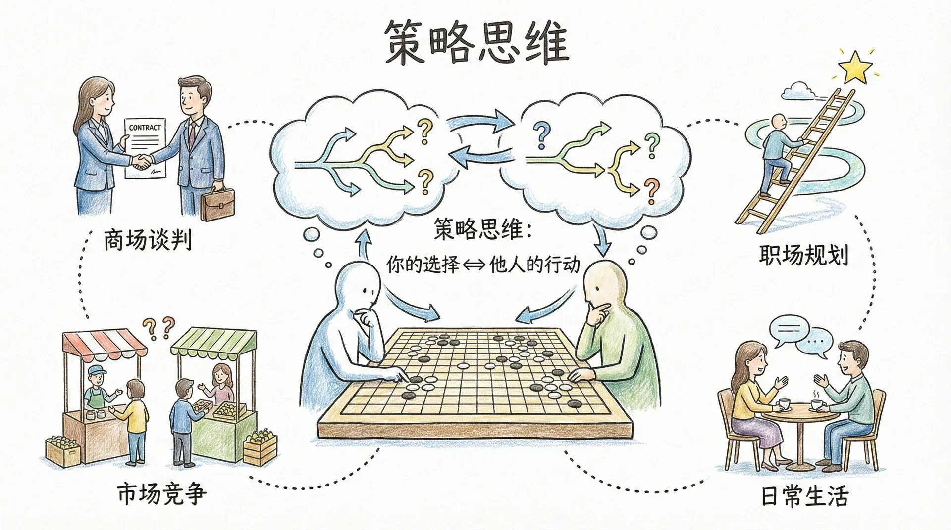 策略思维是一种特殊的思考方式,它帮助我们在复杂的社会互动中做出更明智的决策。当你在商场谈判、在职场规划、在市场竞争,甚至在日常生活中与他人互动时,策略思维都能发挥重要作用。这种思维方式的核心在于:你的最佳选择取决于他人将如何行动,而他人的选择又取决于他们对你行动的预期。