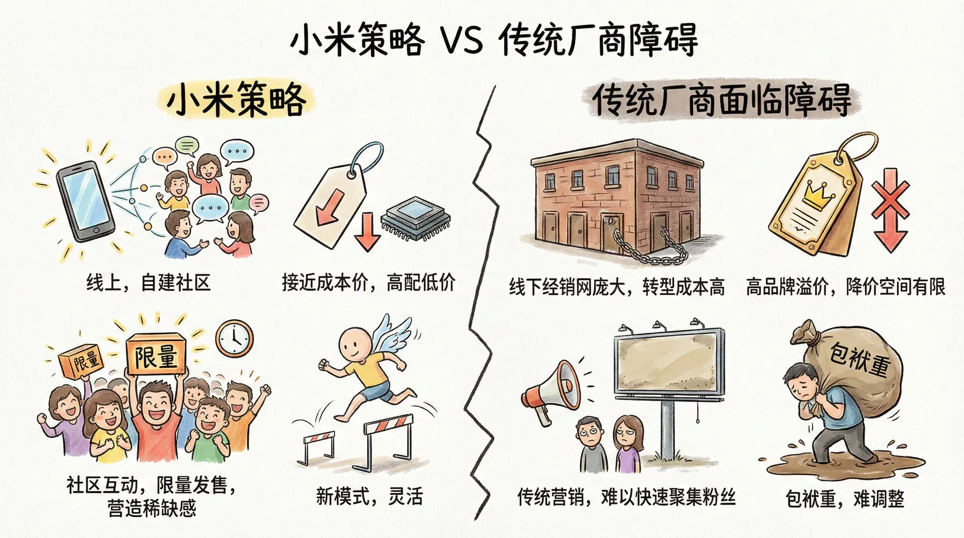 我们先以定价策略为例,华为与小米的“高配低价”打法和特斯拉的“价格战”都体现了精妙的策略考量。以2023年新能源车市场为例,比亚迪与特斯拉多次互相试探性降价,目的不仅仅在于争取消费者,更在于测试对方的成本底线和反应弹性。以小米进军智能手机行业来看,雷军没有直接和苹果、三星做高端正面决战,而是通过“线上直销+高性价比+稀缺营销”,创造了一条传统厂商难以模仿的新路径:绕开线下重资产,降低渠道成本,通过“饥饿营销”激发用户焦虑。这套策略让小米“步步为营”,快速建立了自己的护城河。