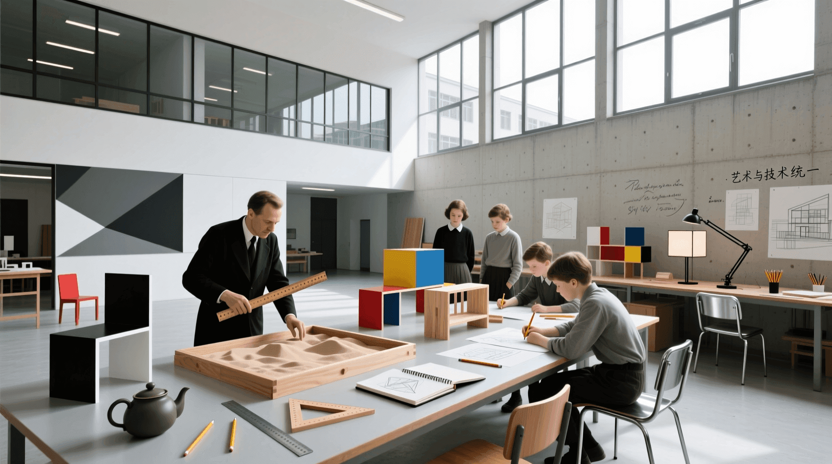 约翰内斯·伊顿负责基础课程的教学。他的课程强调个人创造力的解放和对材料的直观感受。伊顿要求学生进行各种练习,如研究不同材料的质感、探索形式的韵律、分析色彩的对比。这些练习帮助学生建立起对设计基本要素的敏感。伊顿的教学方法充满神秘主义色彩,他甚至引入了东方哲学和呼吸冥想。