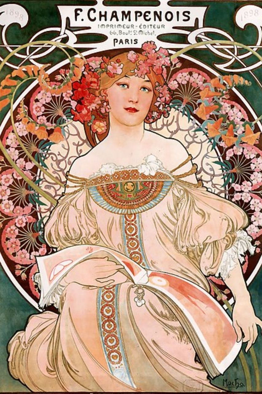 捷克画家阿尔丰斯·慕夏虽然主要在巴黎工作,但他创造的海报风格成为新艺术平面设计的典范。慕夏的海报以优雅的女性形象为中心,周围环绕着装饰性的花卉图案和流畅的曲线。他的作品色彩柔和,构图平衡,既有装饰性又保持了清晰的视觉传达。慕夏的风格被广泛模仿,成为新艺术平面设计的代表性样式。