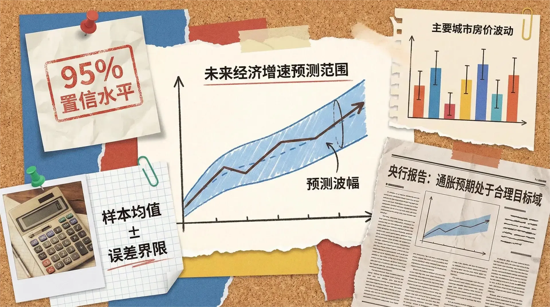 置信区间的核心思想是:我们虽然无法直接获得真实参数θ的精确数值,但可以依据样本数据,构造一个统计区间,使得该区间在预定概率(如95%)下包含真实参数值。例如: