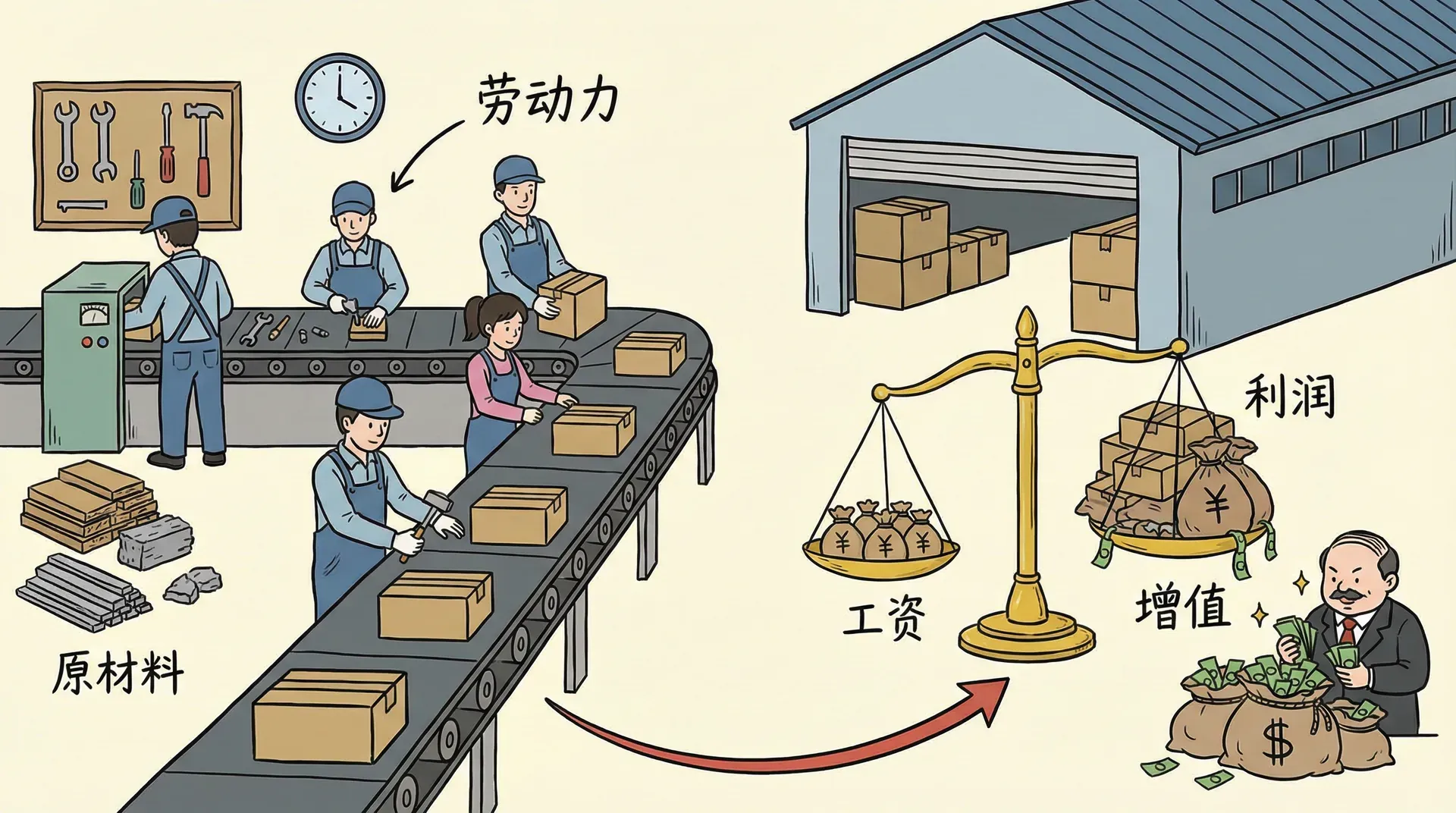 当我们跨越流通领域的门槛,进入“生产领域”这个悬挂着“非公莫入”警告牌的神秘空间,资本增殖的真正秘密便逐渐浮现。表面上,买卖双方在流通领域里以等价交换的方式进行交易,一切看似公平合理,但进入生产领域后,隐藏在等价交换表象之下的剥削关系才开始显现。