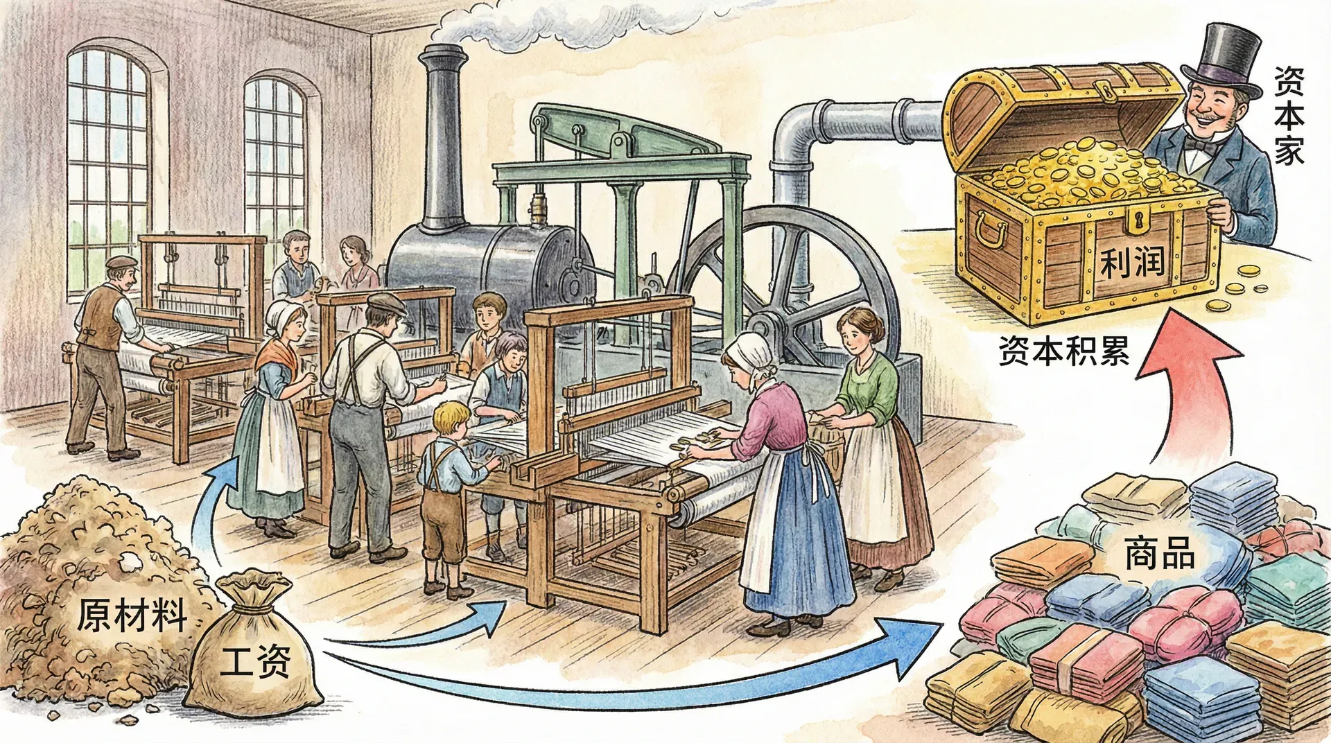 只要资本家以等价物交换采购材料、机器和劳动力,并“合法”地消费这些商品的使用价值,所有条件就都具备了。市场规律在表面上没有任何破坏,剩余价值却在劳动过程的运动中“自动诞生”。