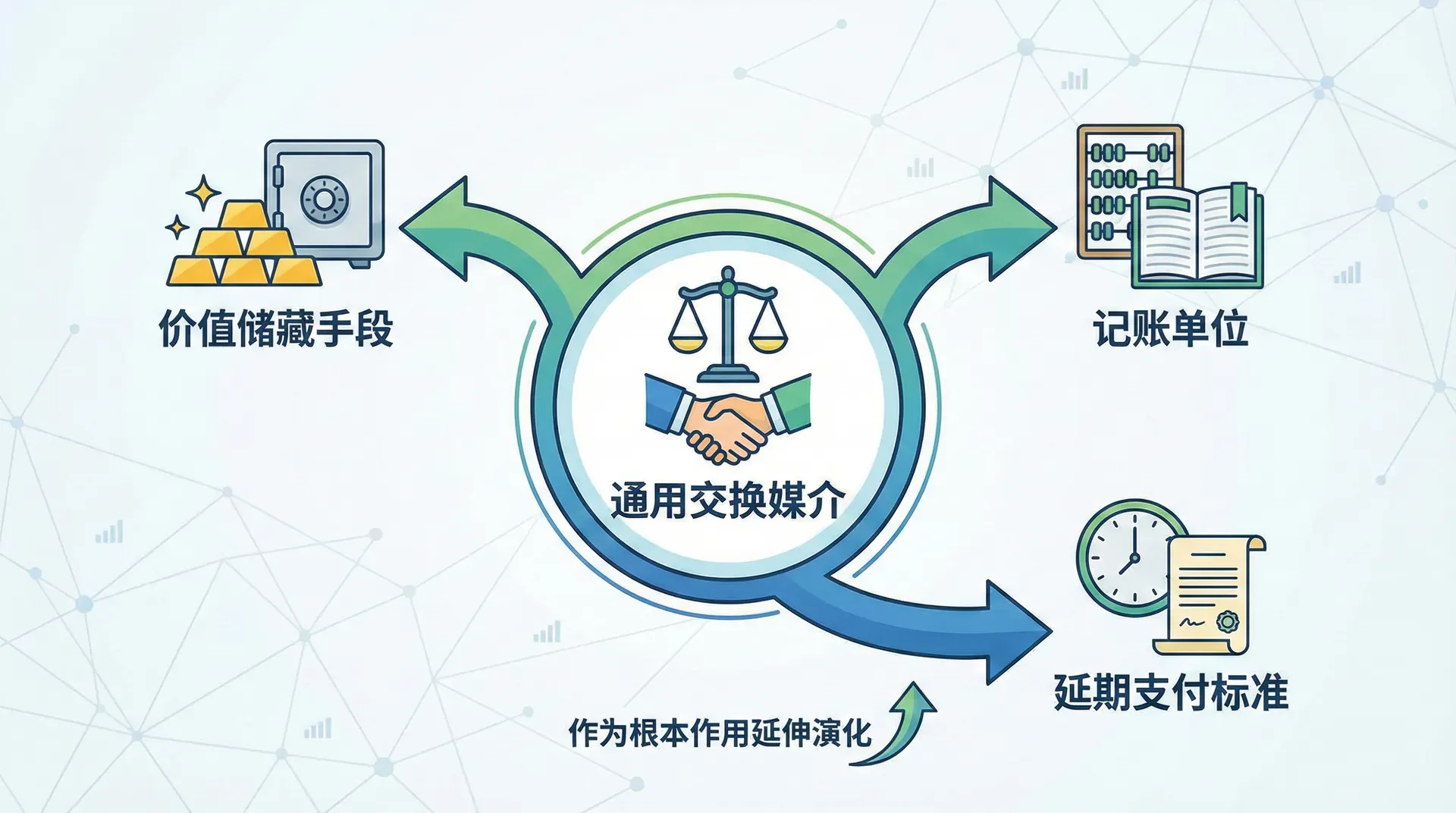 许多人认为,货币除了作为交换媒介之外,还承担着诸如价值储藏手段、记账单位、延期支付标准等多种“功能”。但实际上,这些所谓的次要功能,都可以从货币作为通用交换媒介的根本作用延伸、演化而来。