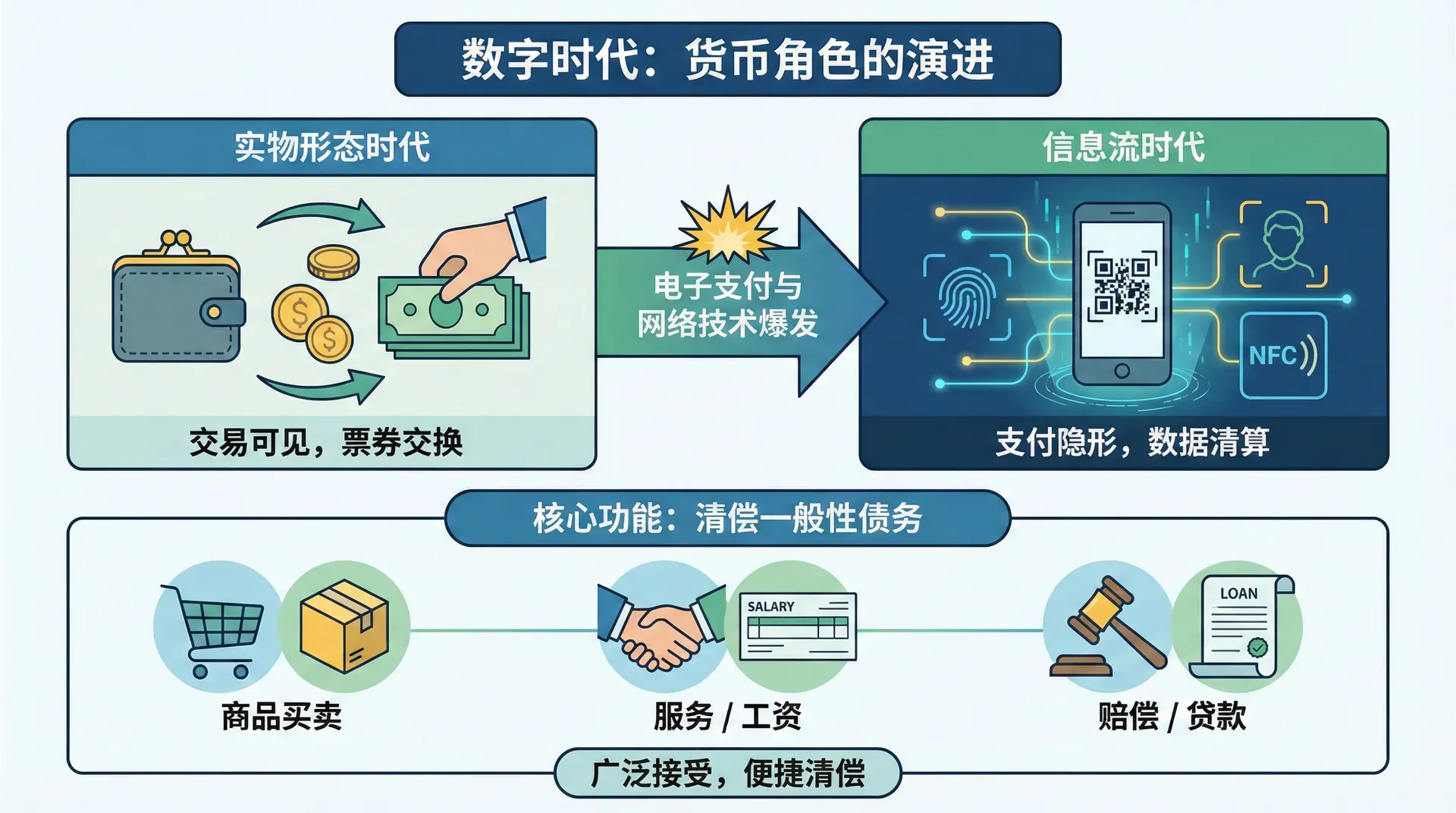 随着电子支付和网络技术的爆炸式发展,货币作为“通用支付媒介”的功能变得前所未有地突出。所谓通用支付媒介,是指货币能够作为清偿一般性债务(无论是商品买卖,还是服务、工资、赔偿、贷款等)被广泛接受。进入数字时代,支付本身变得更加“隐形”:无论是实体钱包,还是二维码、指纹、刷脸、NFC,货币在交易中的角色已由实物票券转为信息流,极大提升了支付便捷度。