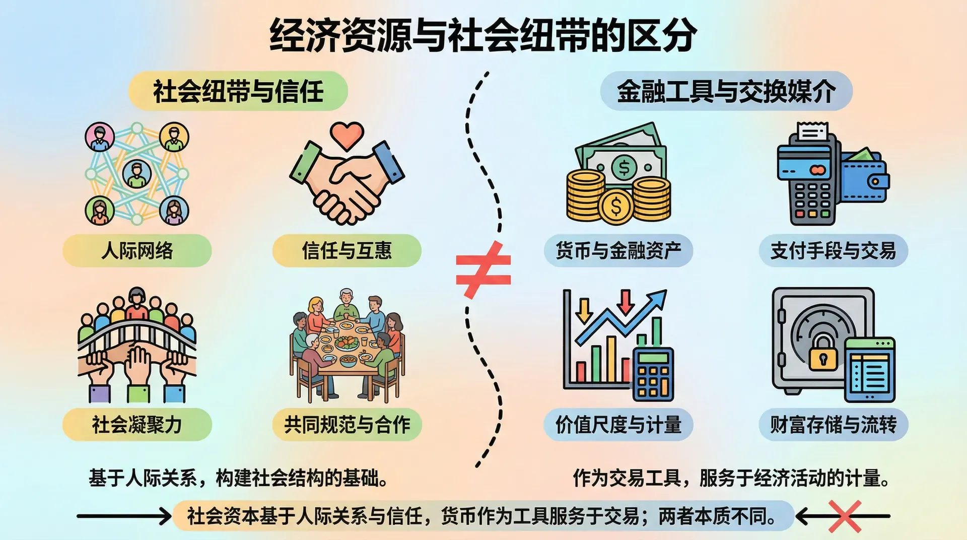 从社会资本的角度分析,货币本身并不直接等同于社会资本。虽然货币在个人和企业眼中,确实可以用来购买资产和投资,但在社会总体层面,单纯的货币数量增长对社会可支配资源和生产能力的提升却没有直接促进作用。换句话说,印更多的钱不会让社会变得更富有,也不会凭空生成更多的资源、技术或劳动力。