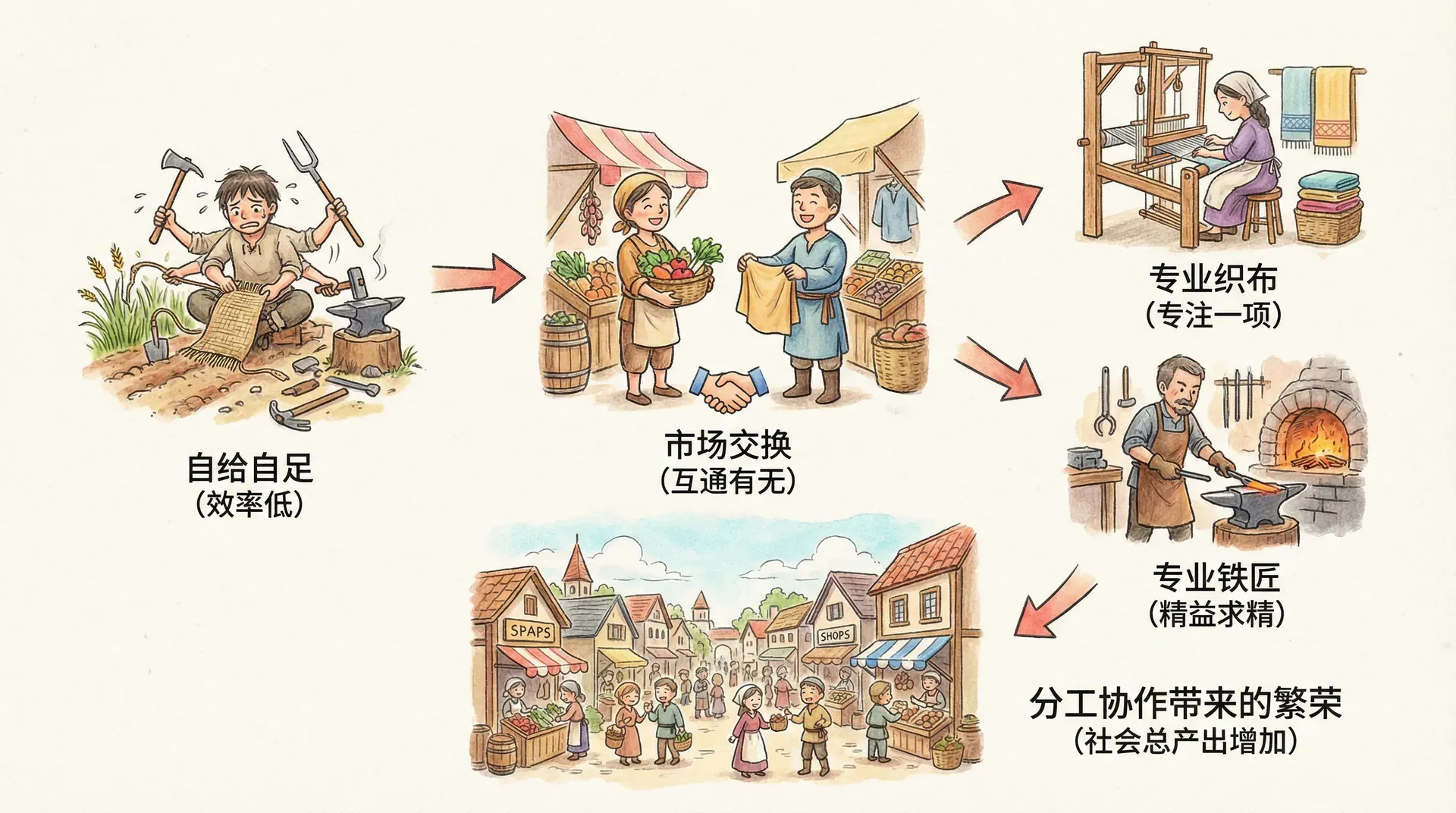 人类的交换倾向天然地推动了专业化分工的不断深化。在市场经济形成的早期阶段,人们逐渐认识到,若专注于自己擅长的领域,再与他人交换,可以极大提高整体福利。