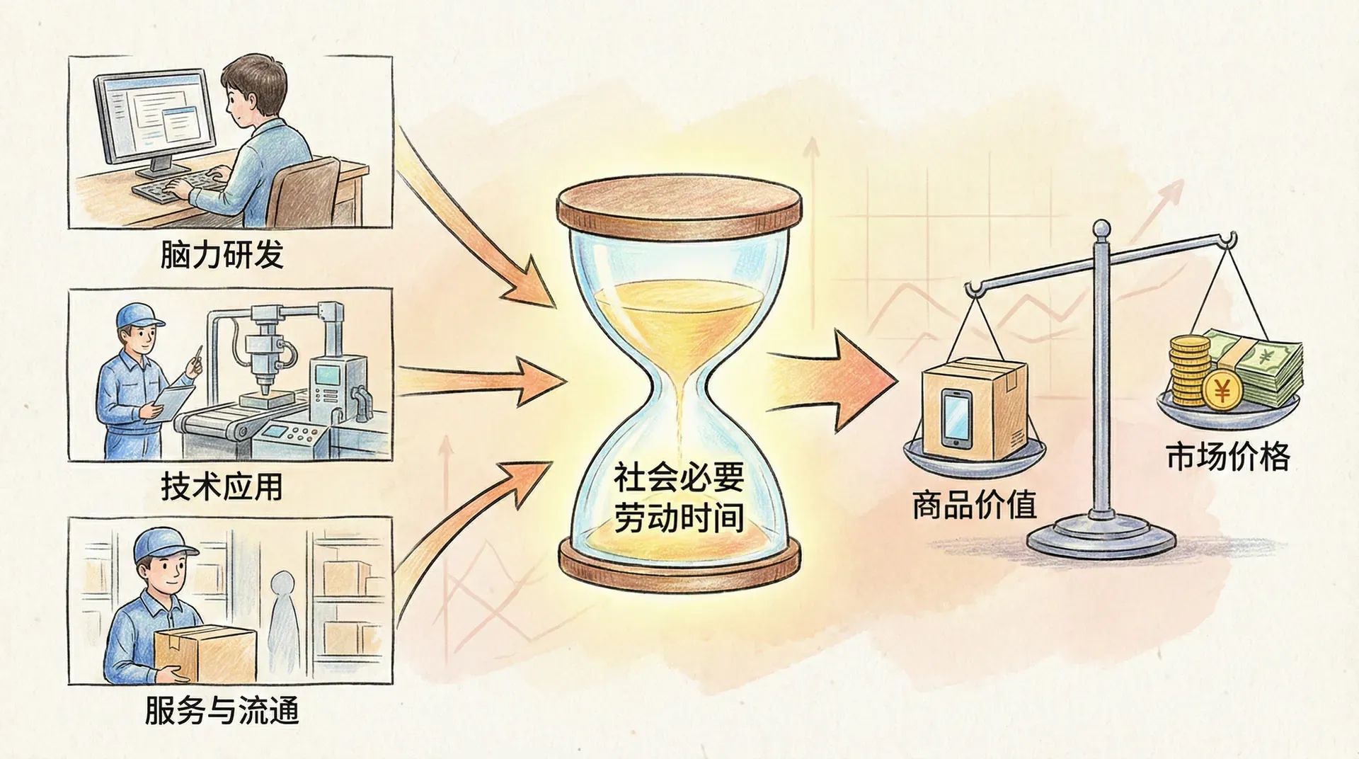 以智能手机为例,十年前一部普通功能手机售价2000元、需30小时社会平均劳动;如今不到2000元能买到遥不可及的高性能手机,这背后正是劳动生产率提升的结果。