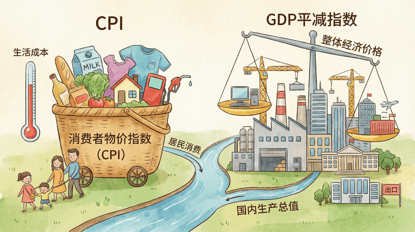 GDP平减指数反映的是经济中所有最终生产的商品和服务价格变化,包括企业、政府和居民购买的产品及服务。而CPI仅关注居民消费支出,计算的是城市和农村居民实际购买和消费的商品与服务价格。比如,军舰、飞机等政府采购的设备计入GDP平减指数,但不计入CPI。反之,一些二手商品、金融资产等也不计入GDP和CPI。