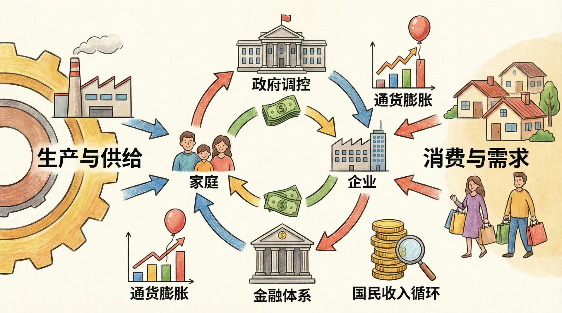在这个简化模型中,我们可以清楚地看到两个循环流动。内层循环代表实物流动:家庭向企业提供劳动力,企业利用这些劳动力生产智能手机并销售给家庭。外层循环代表相应的货币流动:家庭购买智能手机的支出流向企业,企业用部分销售收入支付工人工资,剩余部分作为利润归企业所有者(他们本身也是家庭部门的一部分)。