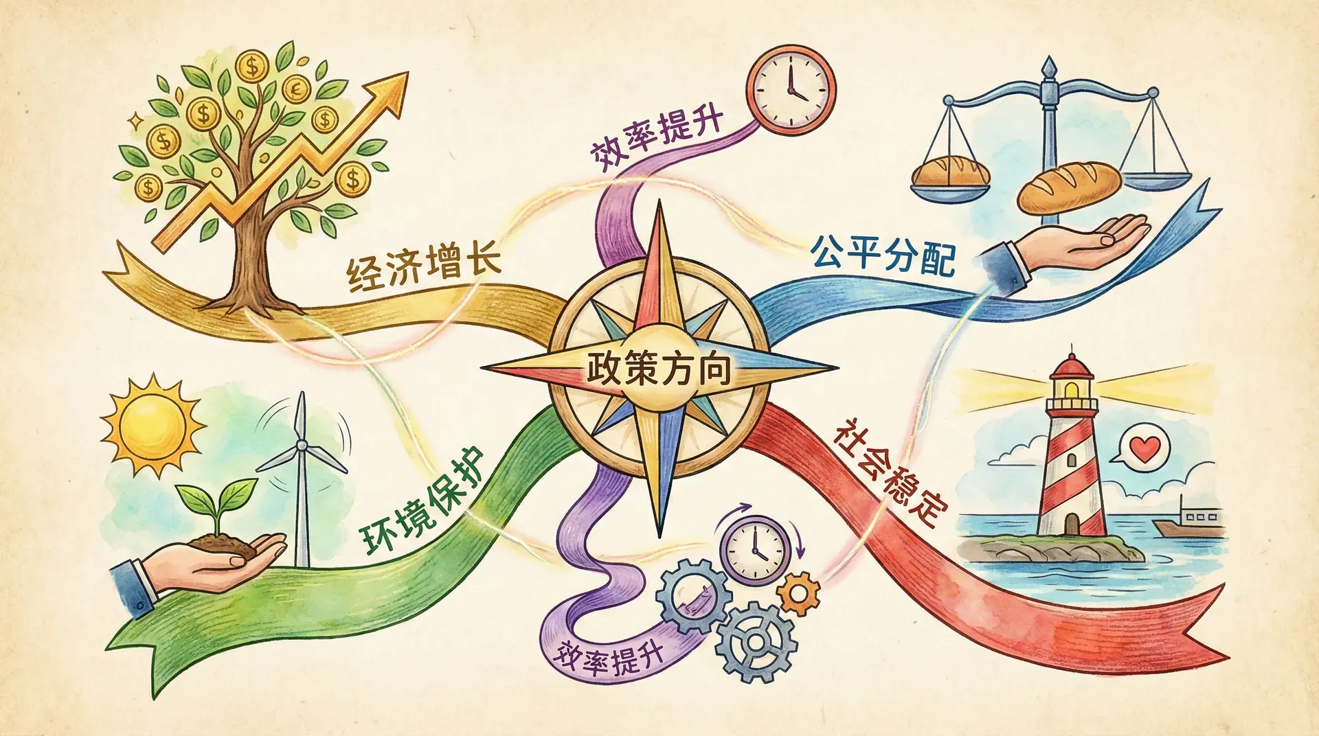 虽然政策分析常聚焦于效率和分配,但实际的政府目标远不止此两者。例如: