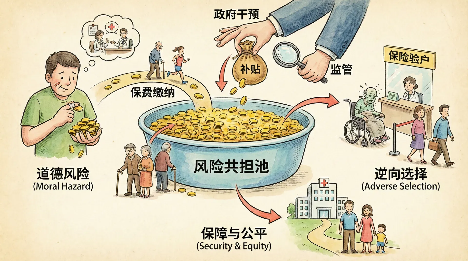 人们之所以购买医疗保险,是因为他们规避风险。相比某一年“运气好”只花极少费用,下一年因重大疾病或事故需支出极高(甚至无法工作的情况下更为致命),多数人更愿意每年稳定缴纳一笔保费,将医疗风险分摊出去。举例而言,如果某人年均预期医疗支出为4000元,哪怕实际花费远小于此,大多人仍然愿意多支付一些——“风险溢价”——以换取心理与经济上的保障。即便保险公司和个人都要承担理赔、核算等交易成本,医疗保险仍有较广泛的需求基础。