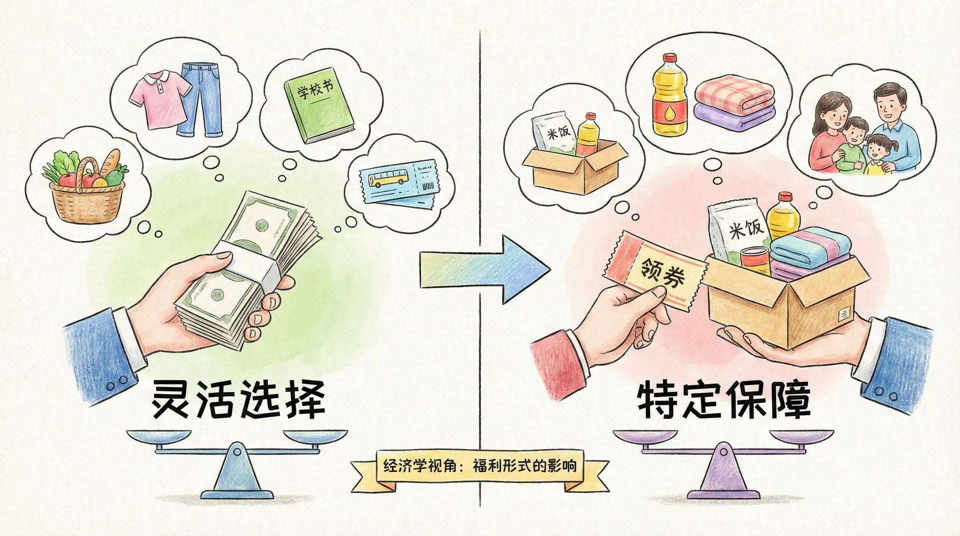 这个对比表明,最优的社会保障体系可能需要现金与实物补助相结合。对于有完全行为能力的成年人,在满足基本需求后,现金补助可以给予他们更大的选择自由。而对于儿童、老人等特殊群体,以及医疗、教育等具有正外部性的领域,实物补助或专项补助可能更为适宜。