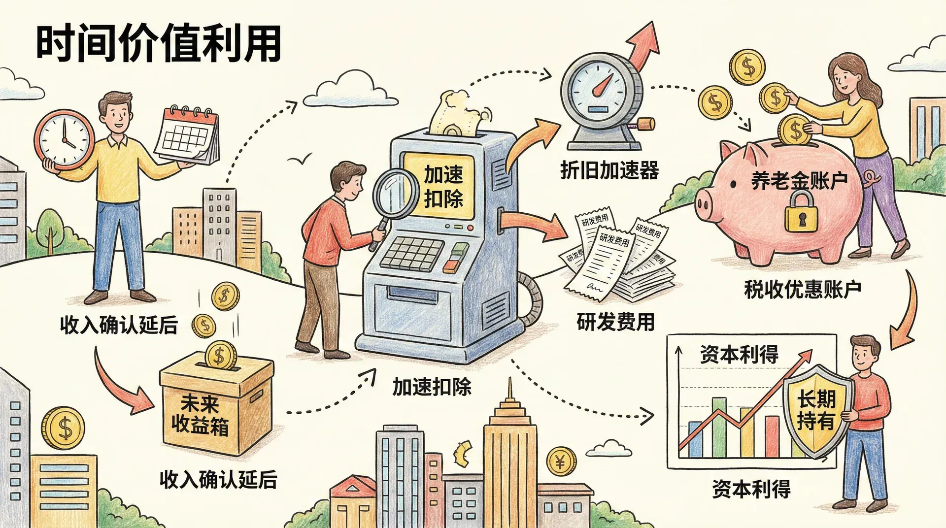 货币具有时间价值,即同一笔金额在不同时间点的实际价值不同。更早拿到的钱可以投资获取收益,因此今天的一元钱总比将来的一元钱更值钱。在税收筹划领域,时间价值原理被广泛用于推迟纳税:只要在税率不变或无重大变化的情况下,有效延后纳税时间,就能让资金在缴税前创造额外收益。