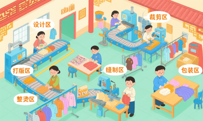 让我们以服装制造业为例来说明这一点。一件成衣的生产涉及众多工序:设计、打版、裁剪、缝制、整烫、包装等。每个工序都可能需要专门的设备和技术。