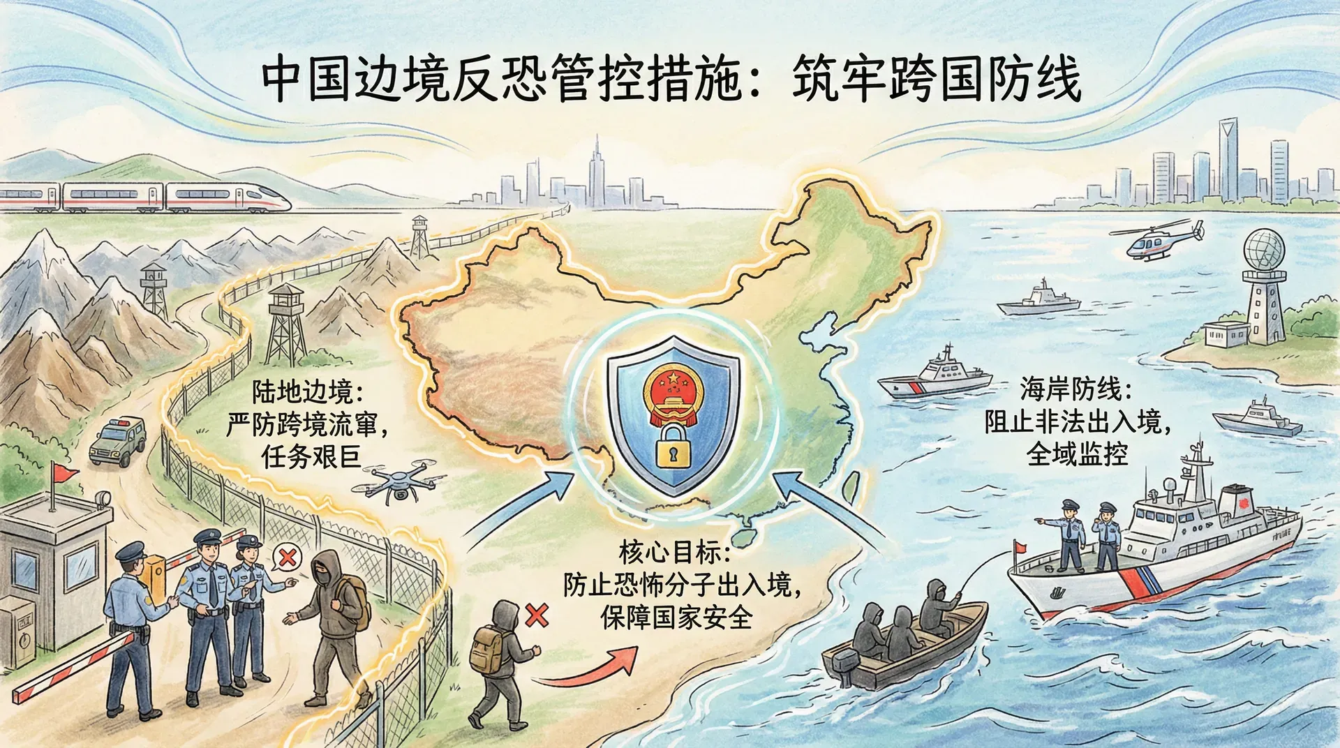 恐怖主义是跨国问题,恐怖分子经常跨境流窜、策划活动。加强边境管控,防止恐怖分子出入境,是反恐工作的重要环节。我国有漫长的陆地边境线和海岸线,边境管控任务艰巨。