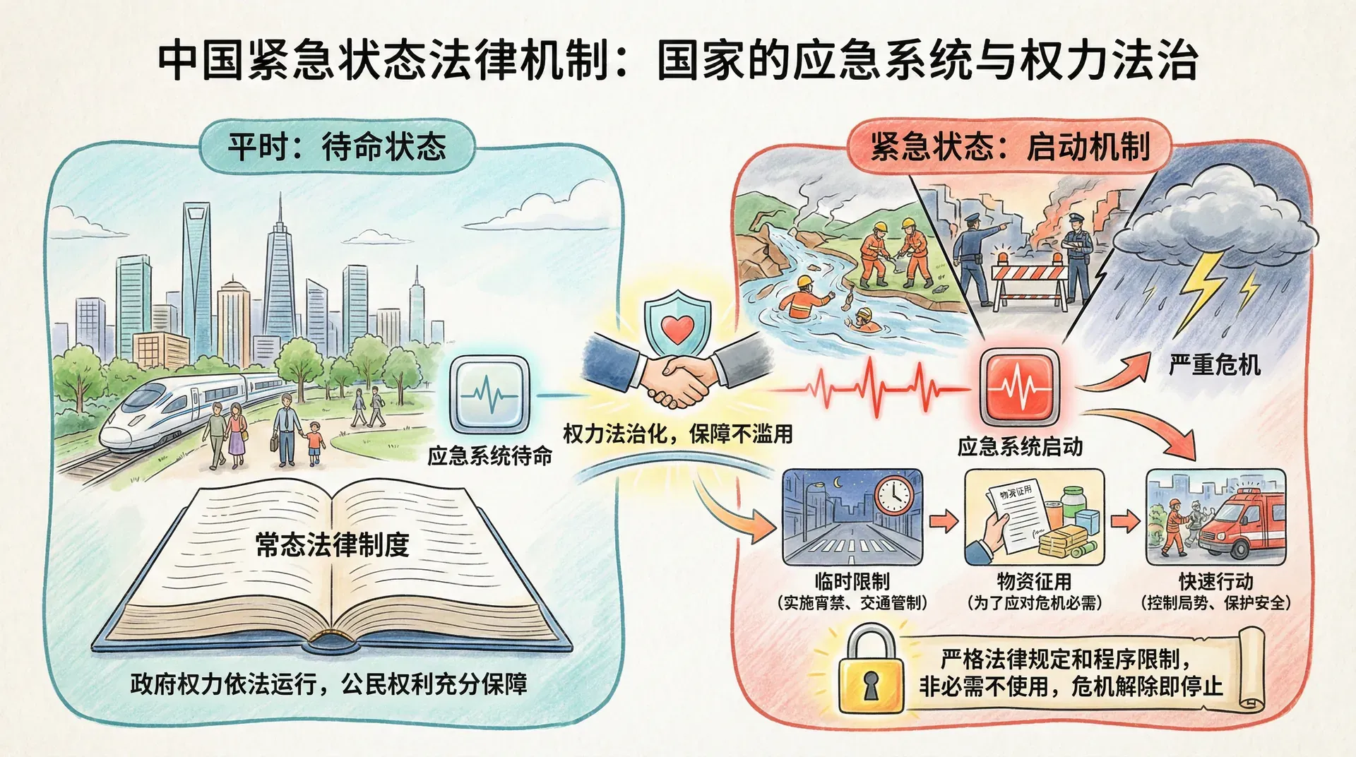 紧急状态机制相当于国家的应急系统。平时这个系统处于待命状态,只有在真正危及国家安全和公共安全的极端情况下才会启动。启动后,政府可以临时限制某些公民权利,如实施宵禁、交通管制、物资征用等,但这些措施必须是为了应对危机所必需的,而且危机一旦解除就应当立即停止。