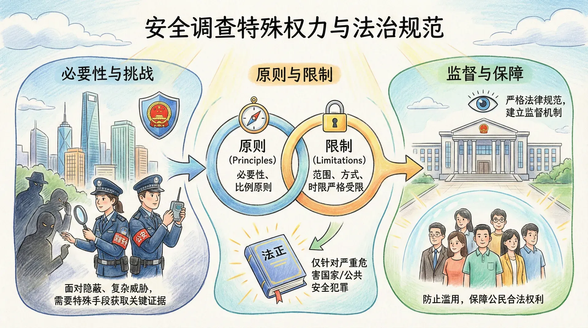 调查权力的行使应当遵循必要性和比例原则。只有在调查严重危害国家安全、公共安全的犯罪时,才能使用这些特殊权力,而且使用的范围、方式、时限都要受到严格限制。