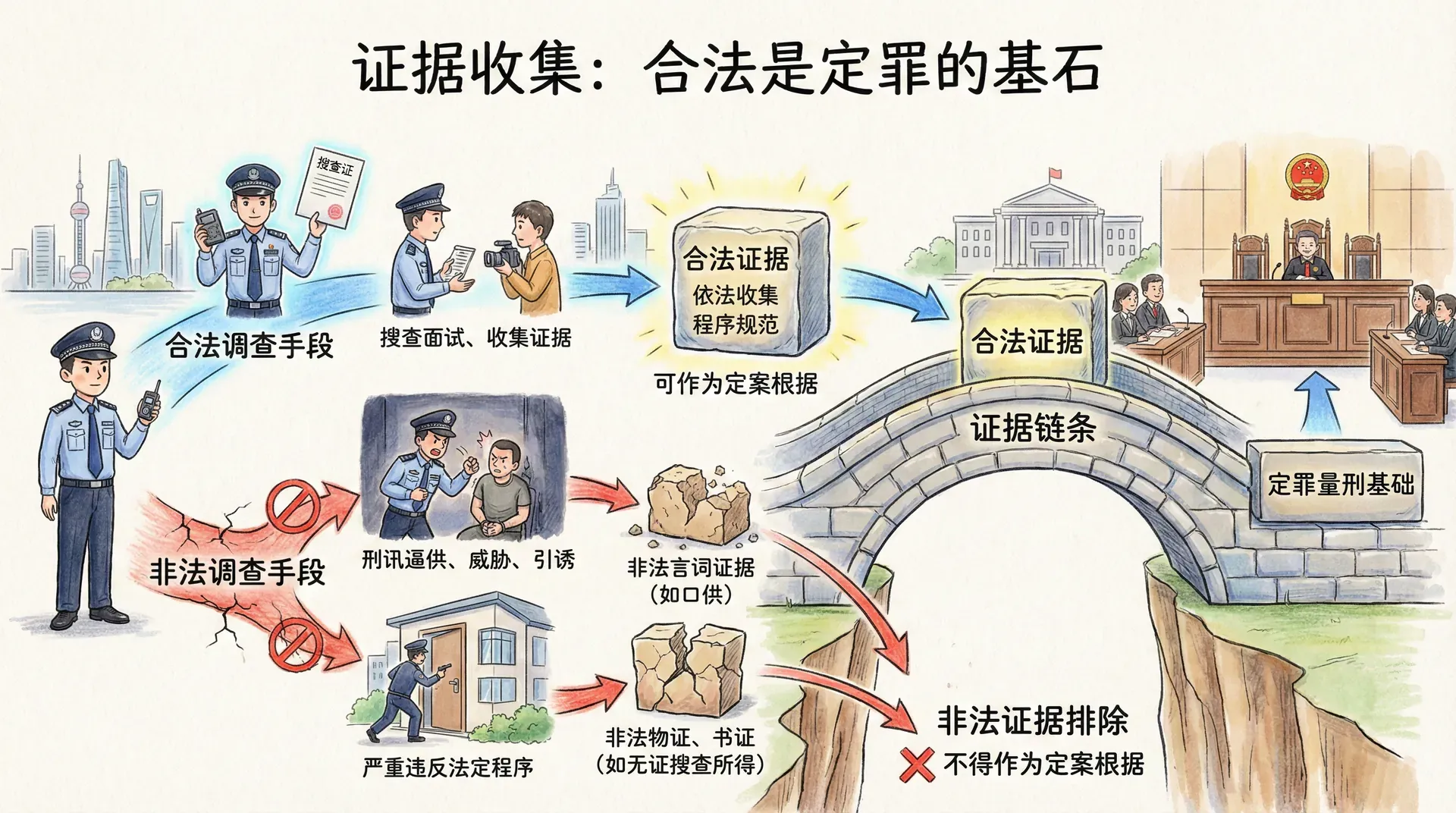 无论采用什么调查手段,最终都要落实到证据的收集上。证据是定罪量刑的基础,证据不合法,即使能证明被告人有罪,也可能被法院排除而无法使用。这就是刑事诉讼中的非法证据排除规则。