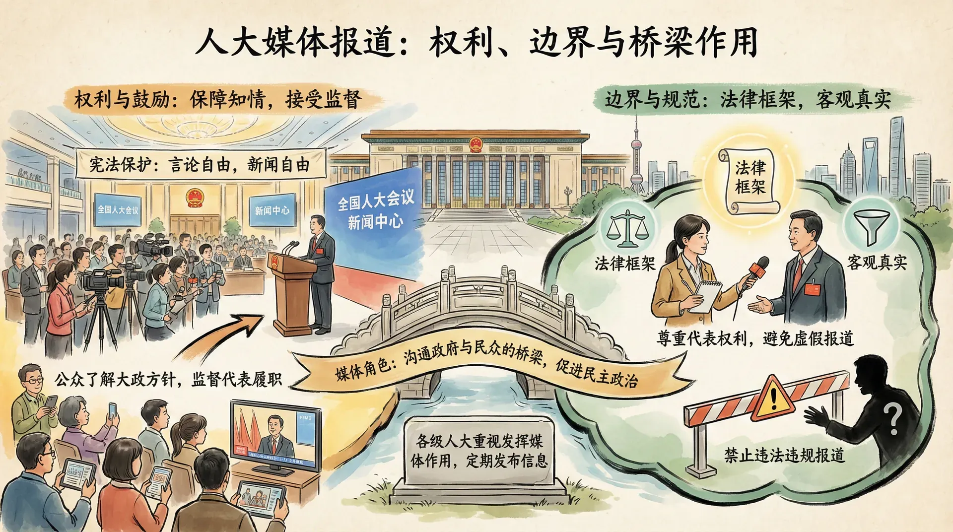 媒体对人大会议的报道是保障公民知情权、实现社会监督的重要途径,但媒体报道也必须在法律框架内进行,尊重代表权利,客观真实。
