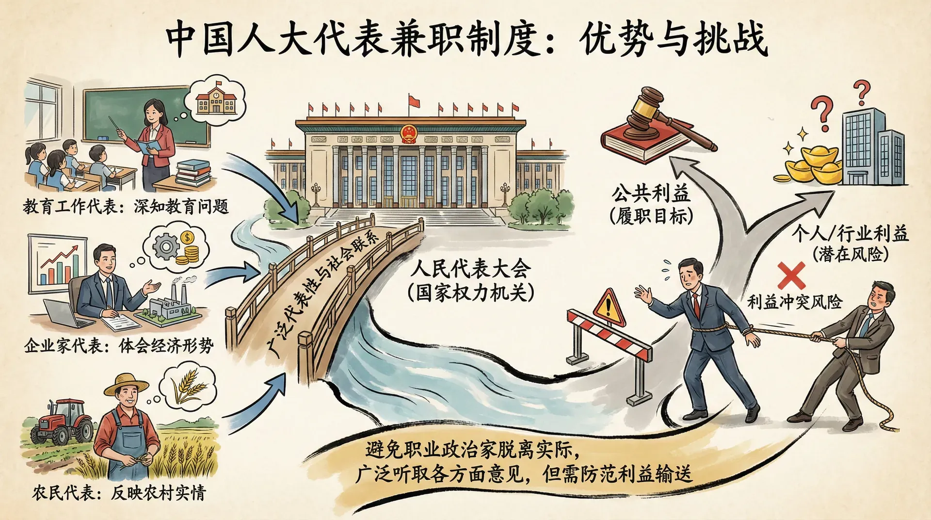 与一些国家议员专职化不同,我国人大代表实行兼职制,代表在担任代表职务的同时,还从事其他职业。这种制度安排有其合理性,但也带来了利益冲突的风险。
