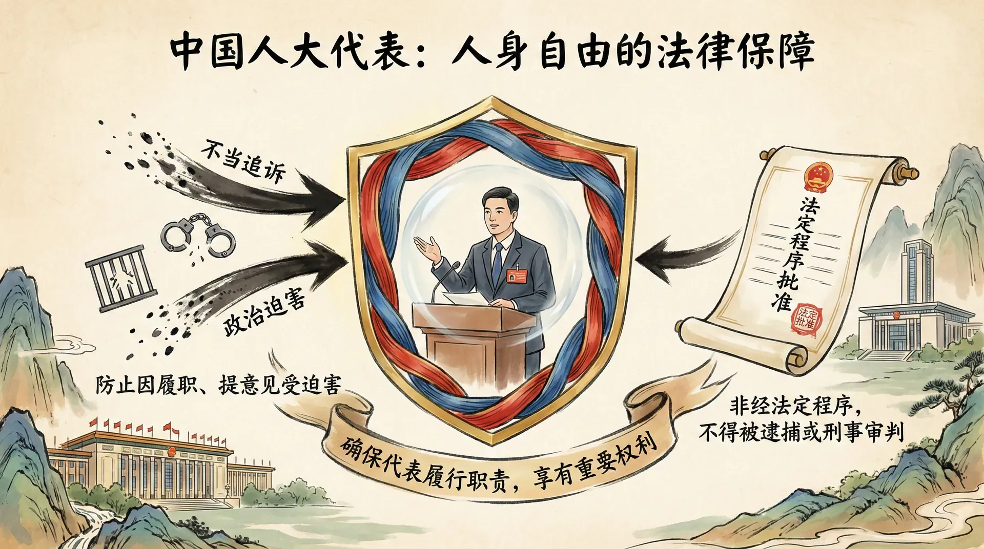 人身自由保障是人大代表享有的一项重要权利,其核心内容是代表非经法定程序批准,不得被逮捕或接受刑事审判。这项保障的目的是防止代表因履行职责、提出批评意见而遭受政治迫害或不当追诉。