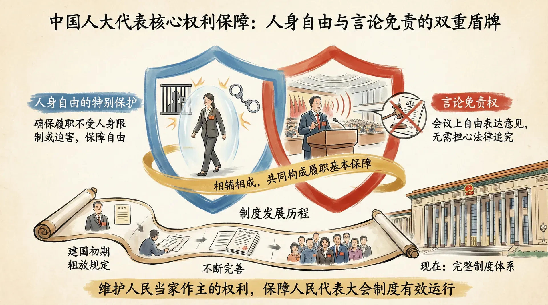 人大代表在履行职责过程中享有的权利保障主要包括人身自由的特别保护和言论免责权两大核心内容。这两项权利相辅相成,共同构成了代表履职的基本保障。人身自由保障确保代表不会因履行职责而遭受人身限制或迫害,言论免责权则保证代表能够在会议上自由表达意见而无需担心法律追究。