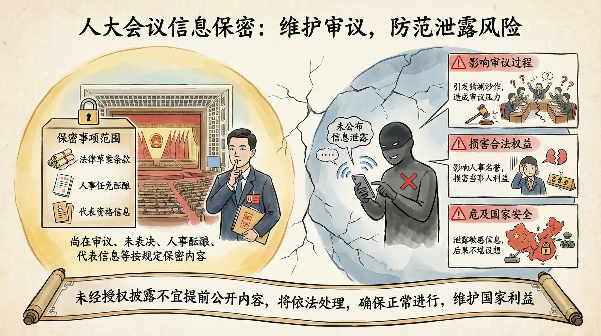 人大会议中有一些内容,虽然在会议内部可以讨论,但在正式决定或公布之前不宜对外披露。对这类信息的未经授权披露,可能造成不良后果,需要依法处理。