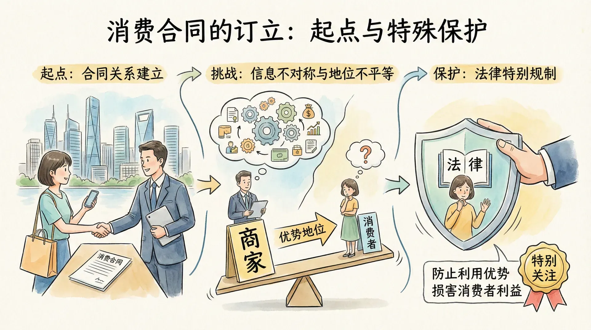 合同的订立是合同关系产生的起点,对于消费合同而言,订立过程中的法律规制更为严格。由于消费者与经营者之间的信息不对称和地位不平等,法律对合同订立阶段给予特别关注,以防止经营者利用优势地位损害消费者利益。