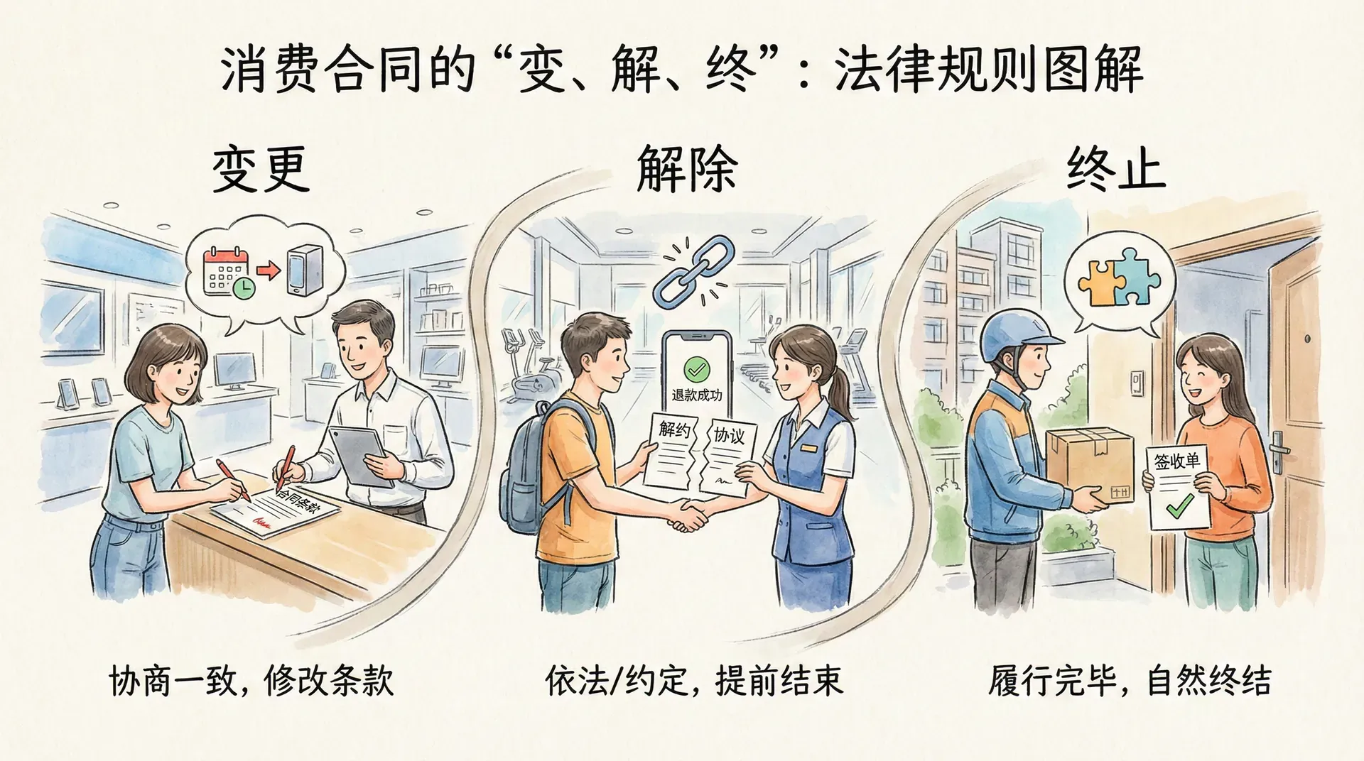 消费合同在履行过程中,可能因各种原因需要变更或解除,也可能因履行完毕或其他原因而终止。理解合同变更、解除与终止的法律规则,对于消费者依法维权、经营者规范经营都具有重要意义。