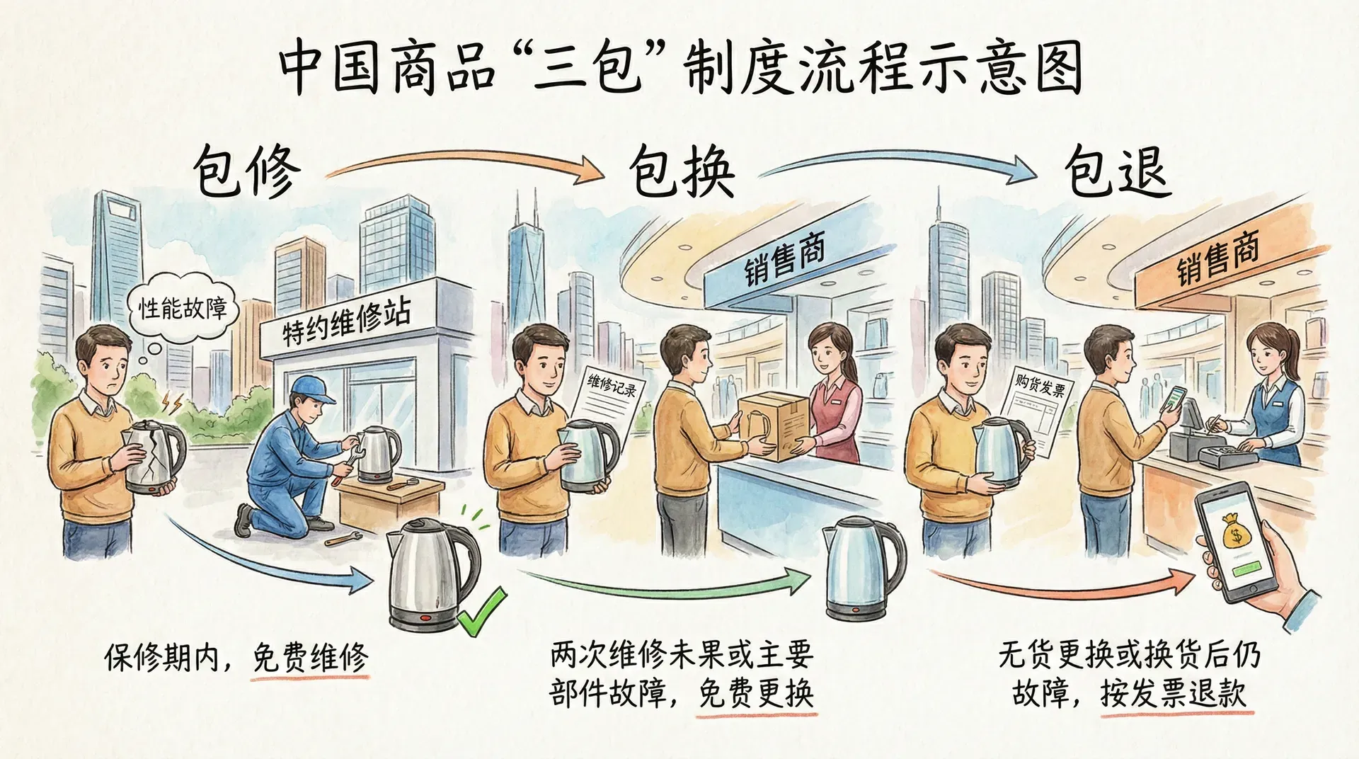 三包制度是中国特色的消费者权益保护制度,指经营者对其销售的商品在一定期限内承担包修、包换、包退的责任。三包制度明确了经营者在商品出现质量问题时的具体义务,为消费者提供了便捷的救济途径。
