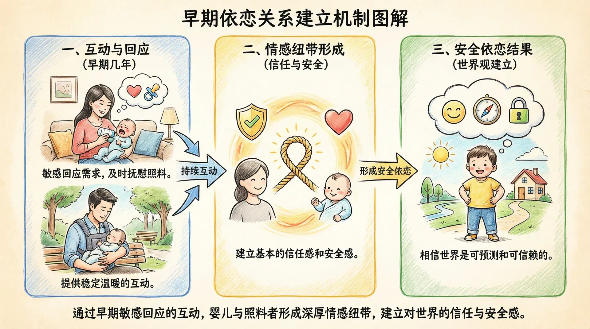 依恋是婴儿与主要照料者之间形成的深厚情感纽带。在生命最初几年,婴儿通过与母亲的互动学习基本的信任感和安全感。如果照料者能够敏感地回应婴儿的需求,及时提供抚慰和照料,婴儿就会形成安全依恋,相信世界是可预测和可信赖的。