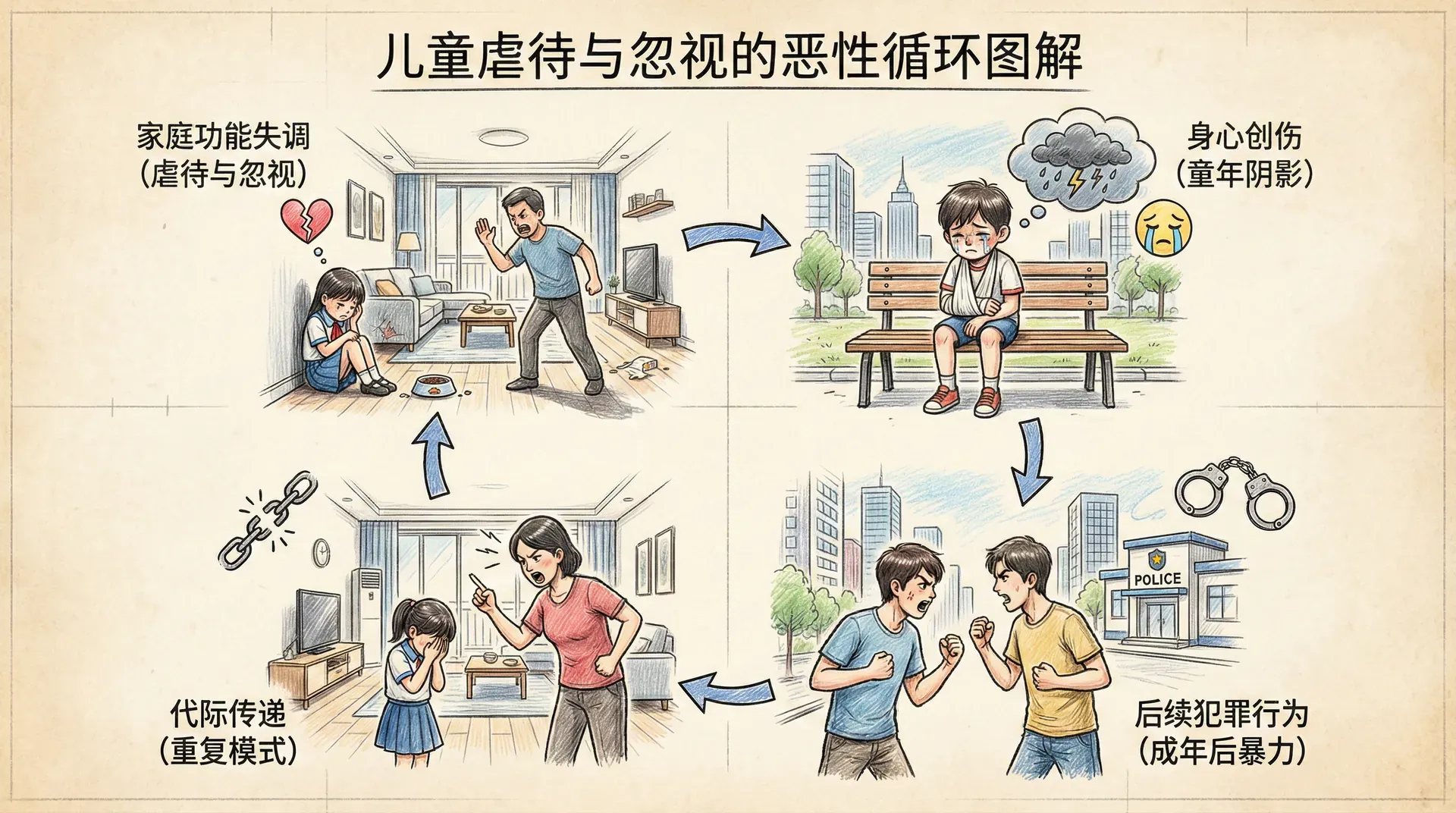 儿童虐待和忽视是家庭功能严重失调的表现,也是导致后续犯罪行为的重要危险因素。遭受虐待的儿童不仅承受巨大的身体和心理创伤,更可能在成年后重复这种暴力模式,形成代际传递的恶性循环。