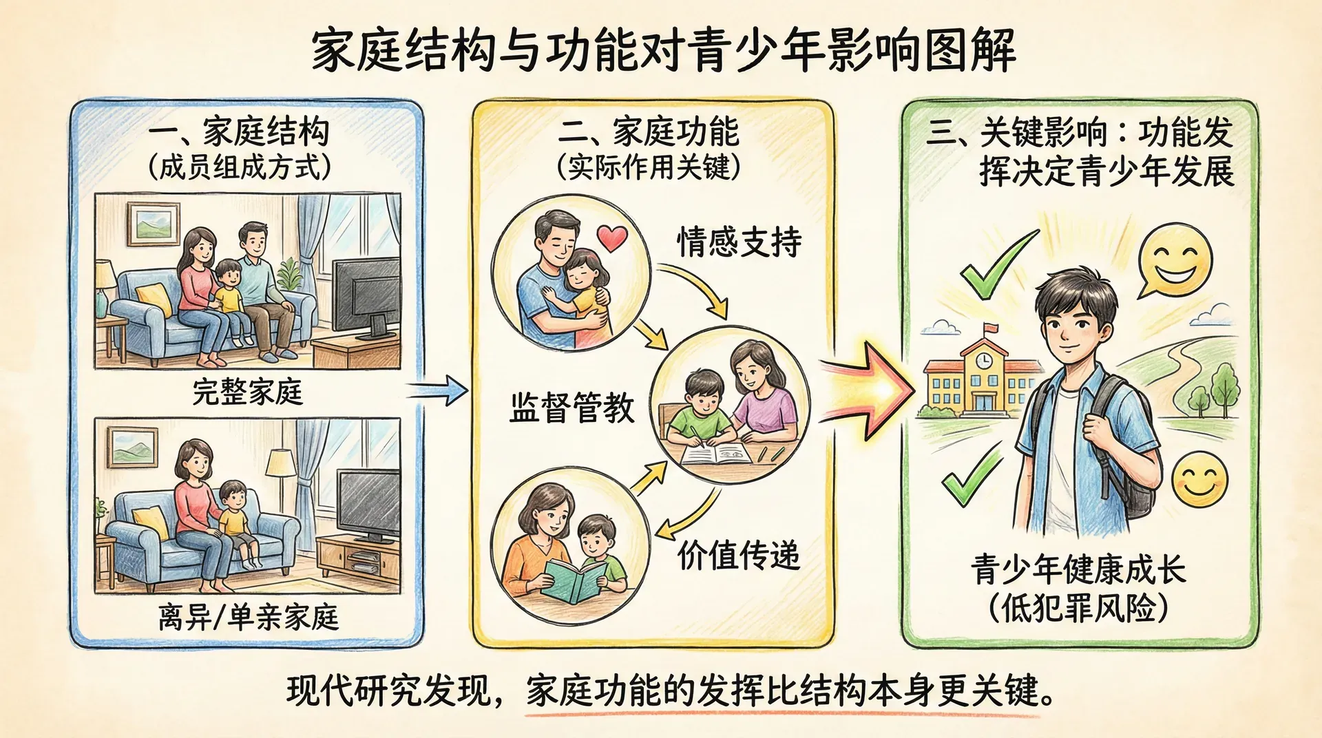 家庭结构指家庭成员的组成方式,而家庭功能则关注情感支持、监督管教、价值传递等方面的实际作用。长期以来,破碎家庭与青少年犯罪之间的关系一直是研究焦点。但现代研究发现,家庭结构本身并非决定性因素,家庭功能的发挥才是关键所在。