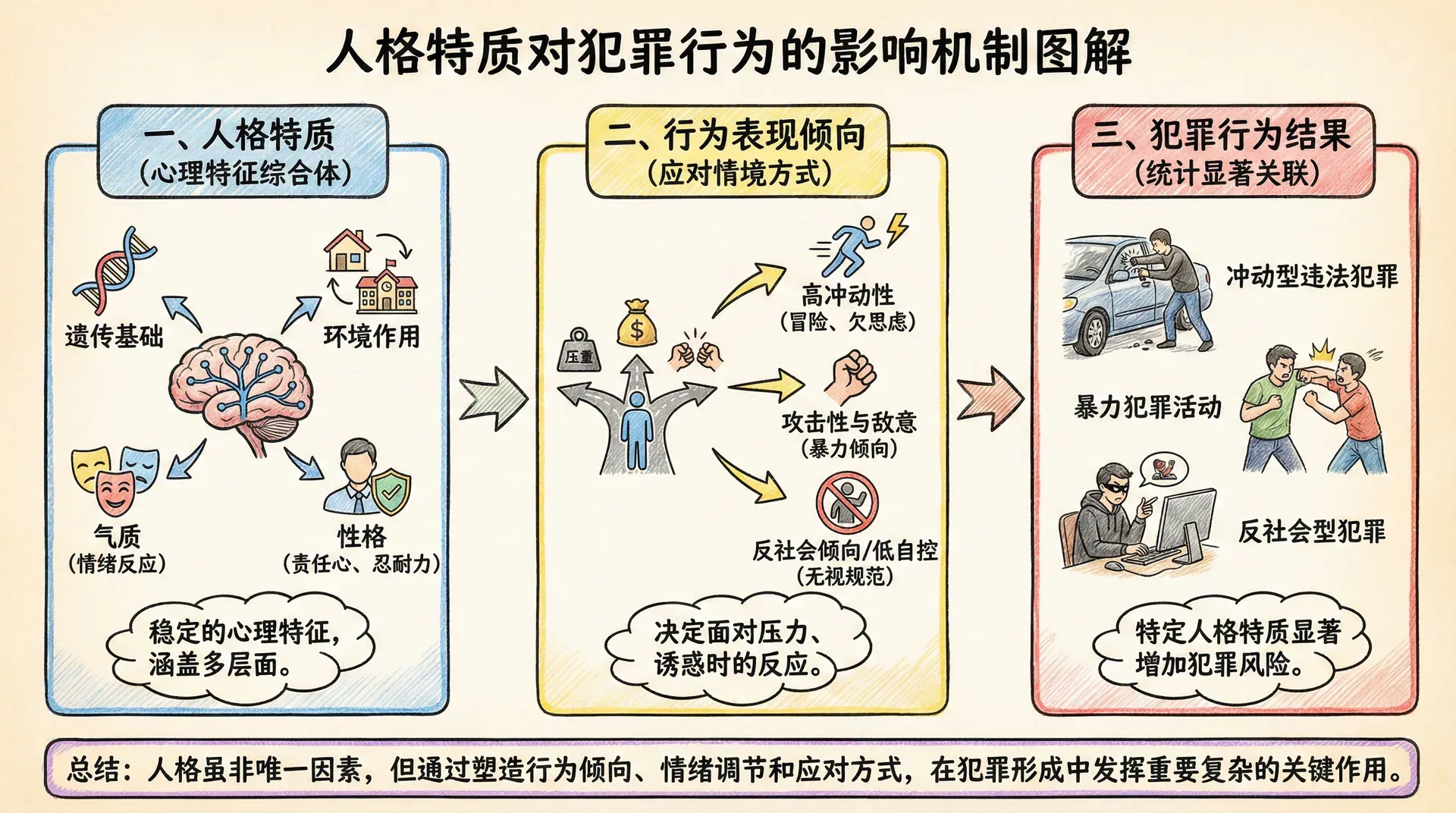在犯罪学研究领域,越来越多的证据显示,某些人格特质(如高冲动性、攻击性、敌意、反社会倾向、低责任心或低自我控制等)与犯罪行为存在显著统计关联。例如,冲动性高的人更容易在缺乏深思熟虑的情况下做出冒险、违法甚至暴力行为;而具有反社会人格特质的个体则往往无视社会规范和他人权利,更易卷入犯罪活动。人格并不是导致犯罪的唯一因素,但它通过塑造个体的行为倾向、情绪调节能力和应对压力的方式,在犯罪形成过程中发挥着重要且复杂的作用。