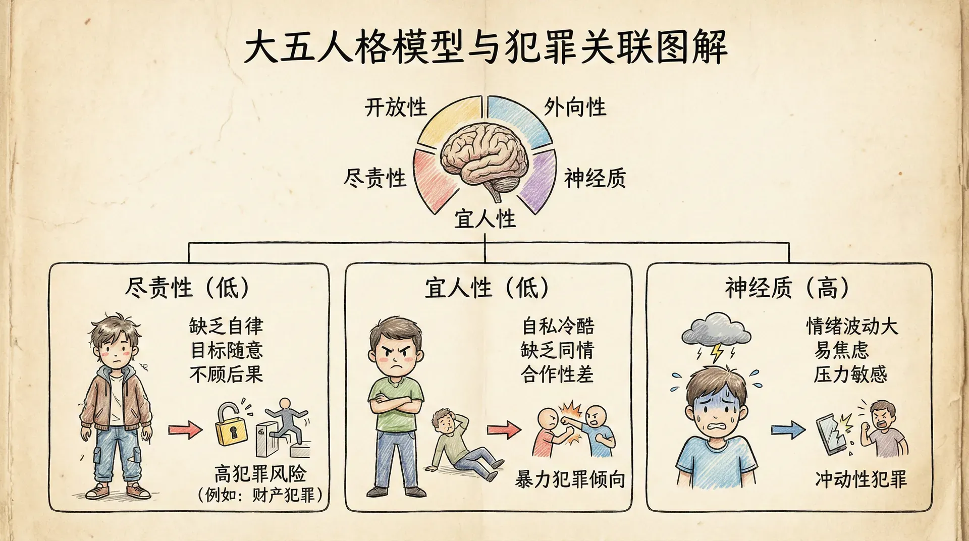 现代人格心理学最具影响力的理论框架是大五人格模型,该模型将人格归纳为五个基本维度——开放性、尽责性、外向性、宜人性和神经质。研究发现,这五个维度与犯罪行为存在系统性关联。
