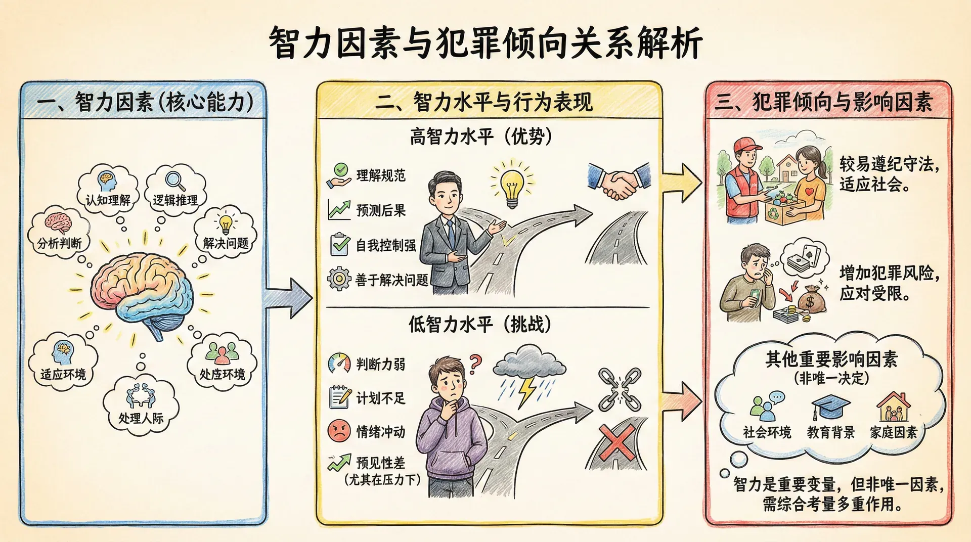 智力是指个体进行认知、理解、推理、分析、判断和解决问题等一系列心理活动的综合能力,它不仅包括抽象思维、语言表达、逻辑推理、学习和记忆等方面,还涵盖适应环境、处理人际关系以及应对现实挑战的能力。从心理学和犯罪学角度来看,智力水平对个人的社会适应性有着直接且深远的影响。