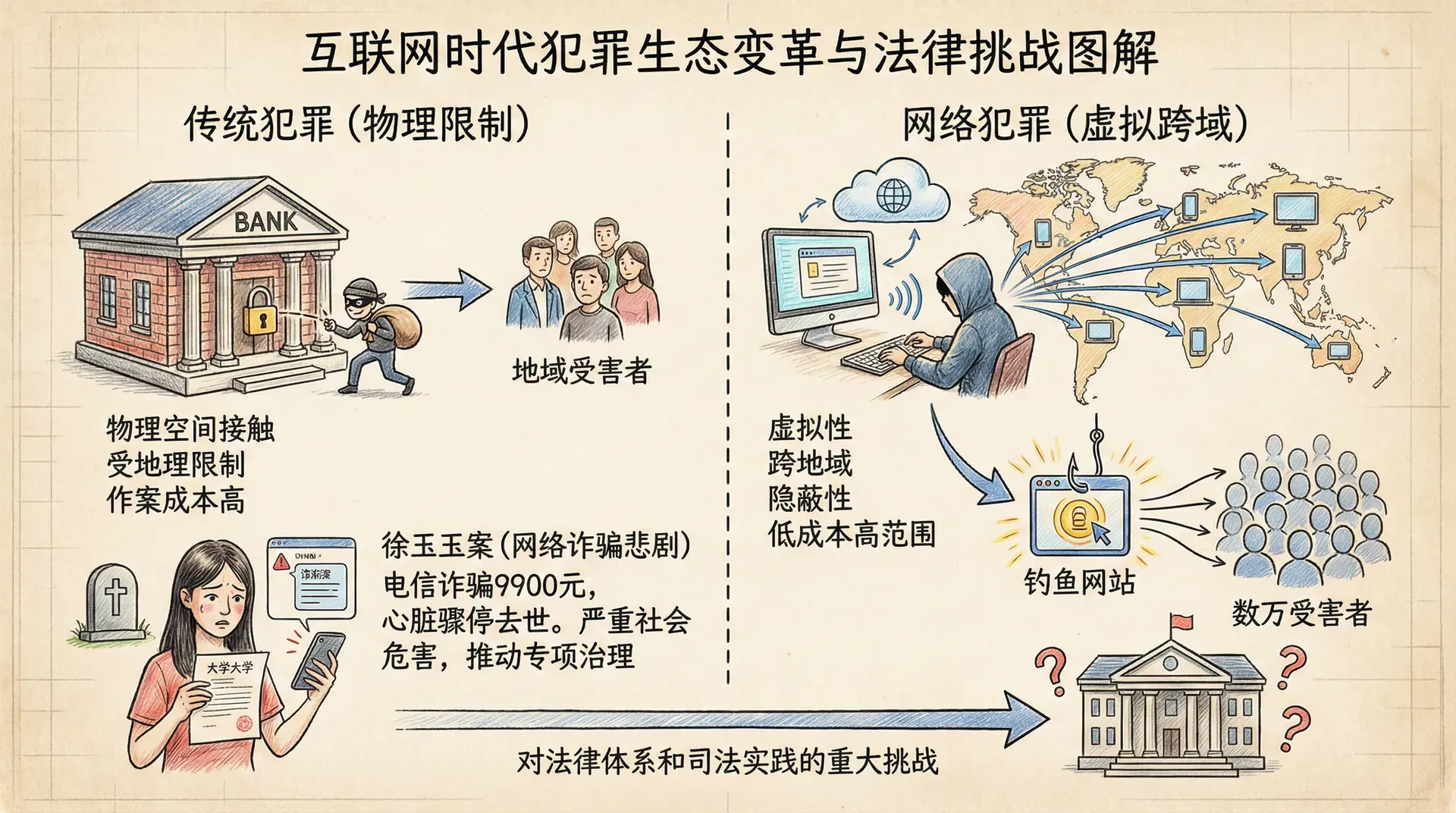 进入21世纪以来,互联网的普及从根本上改变了犯罪的生态环境。传统犯罪需要物理空间的接触,作案对象和范围受到地理限制,而网络犯罪突破了这些限制,呈现出虚拟性、跨地域性、隐蔽性等新特点。从法律视角来看,网络犯罪不仅是犯罪手段的技术升级,更是对现有法律体系和司法实践的重大挑战。